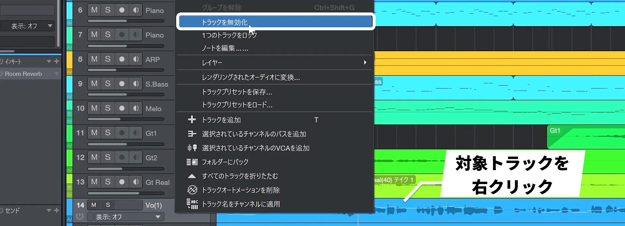 使わなくなったトラックを無効化するには、対象のトラックを右クリックして「トラックを無効化」を選択します。