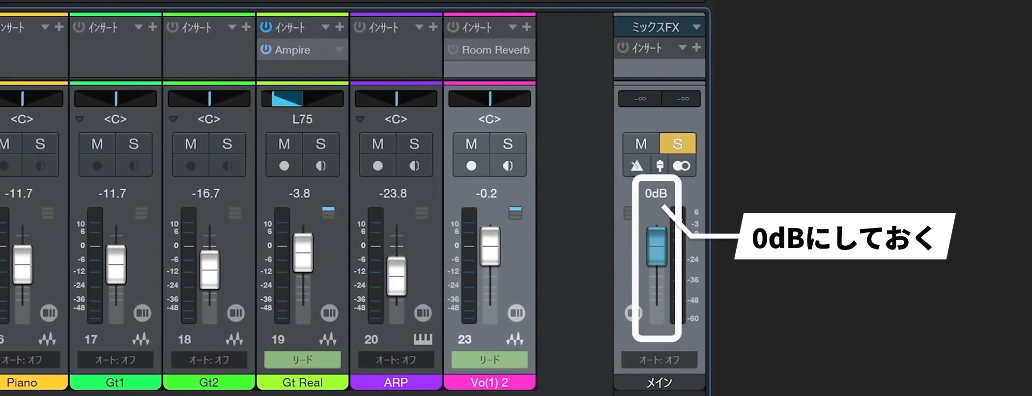 右のマスタートラックのフェーダー位置が制作中に変わっていた場合は、この段階で0dB(初期値)に戻しておきます。