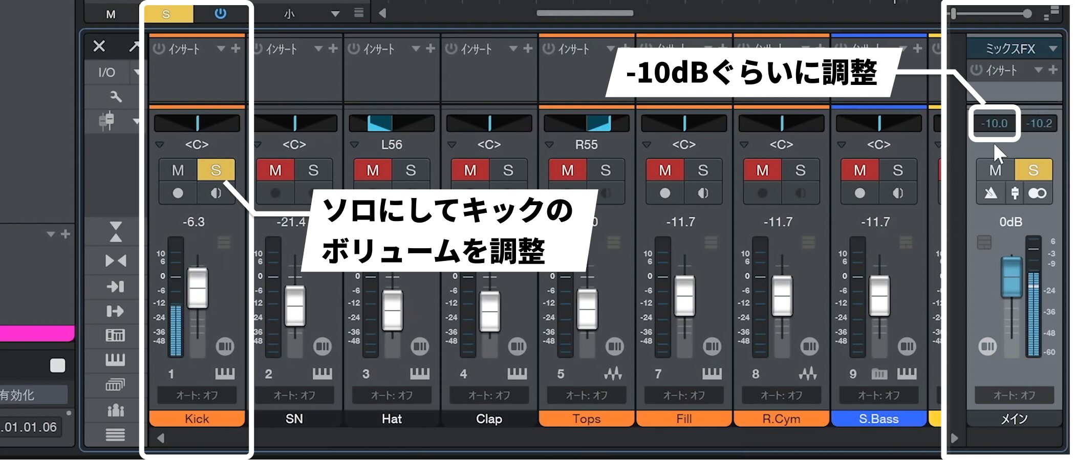 キックトラックをソロにして、マスターメーターが-10dB前後になるように、キックトラックのボリュームを調整します。
