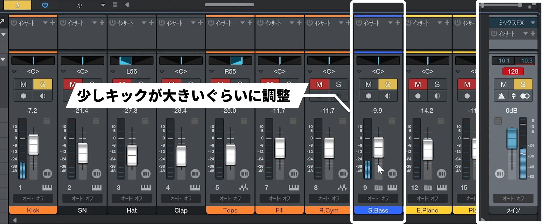 キックのボリュームが整ったら、同じ低域の楽器であるベーストラックのボリュームを調整していきます。