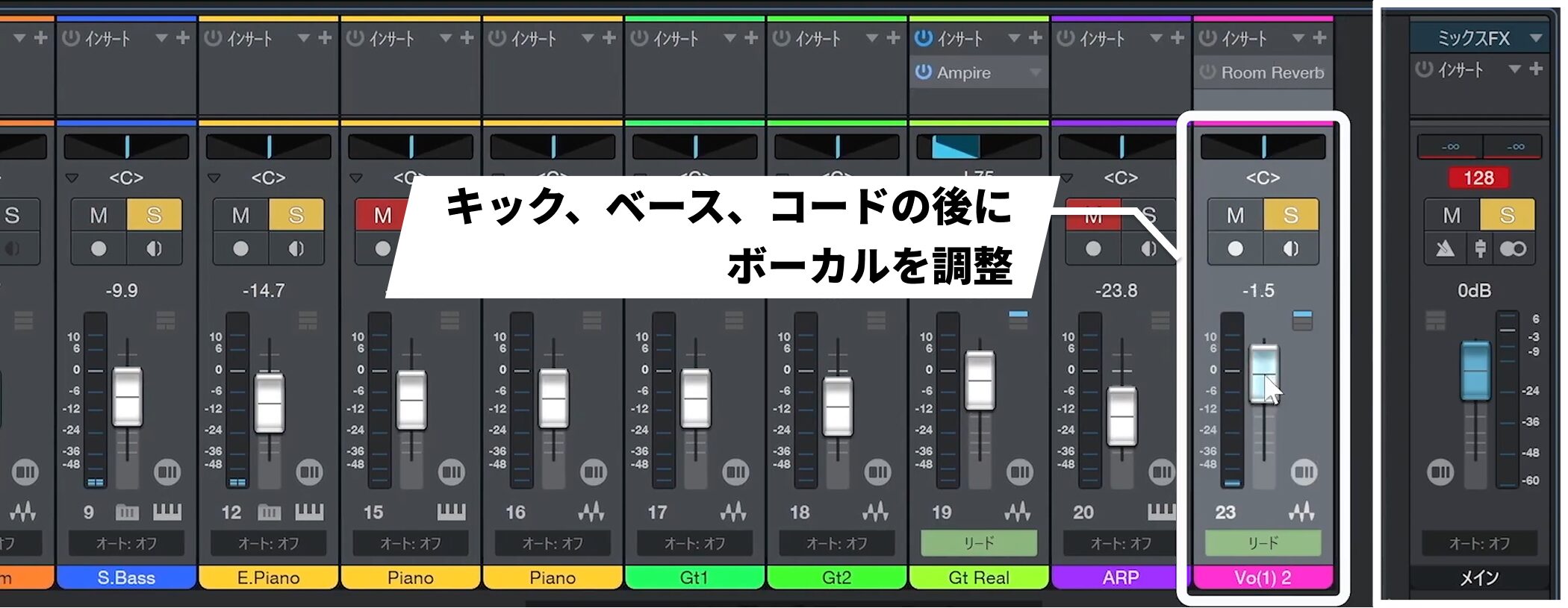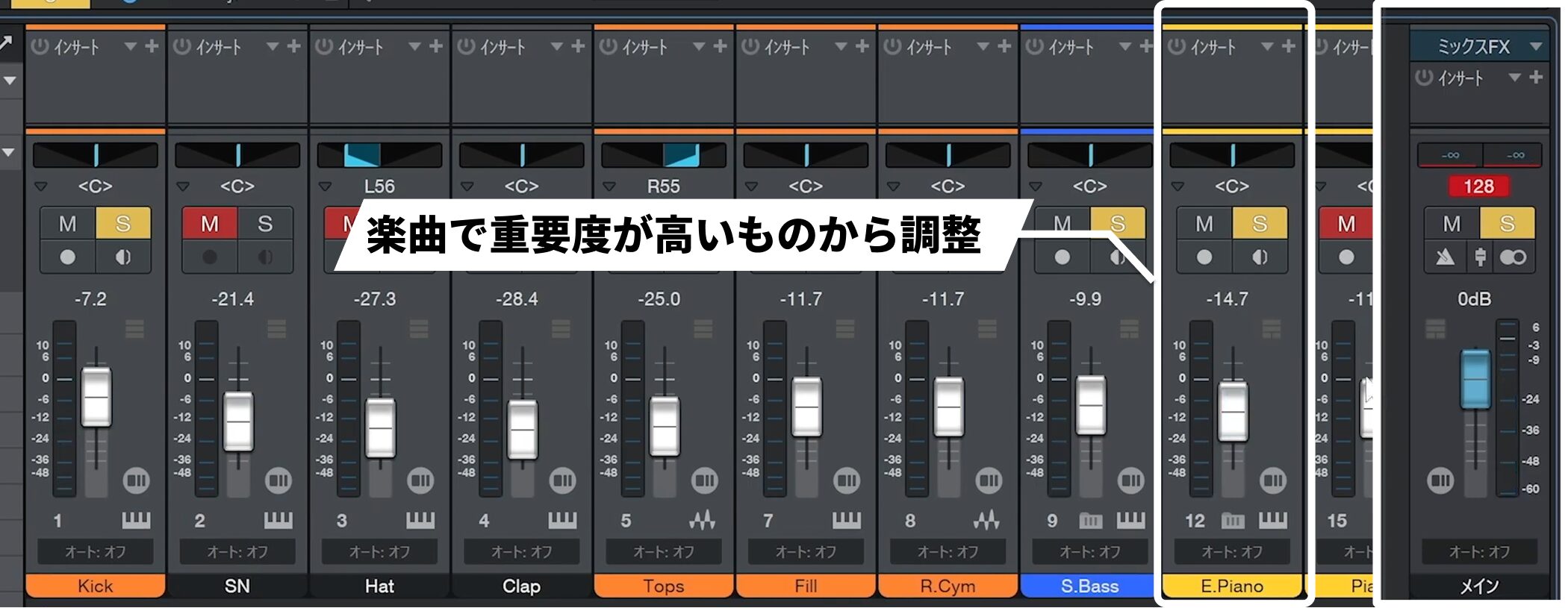 このような形で楽曲の中で重要度が高いものから調整していくとスムーズです。