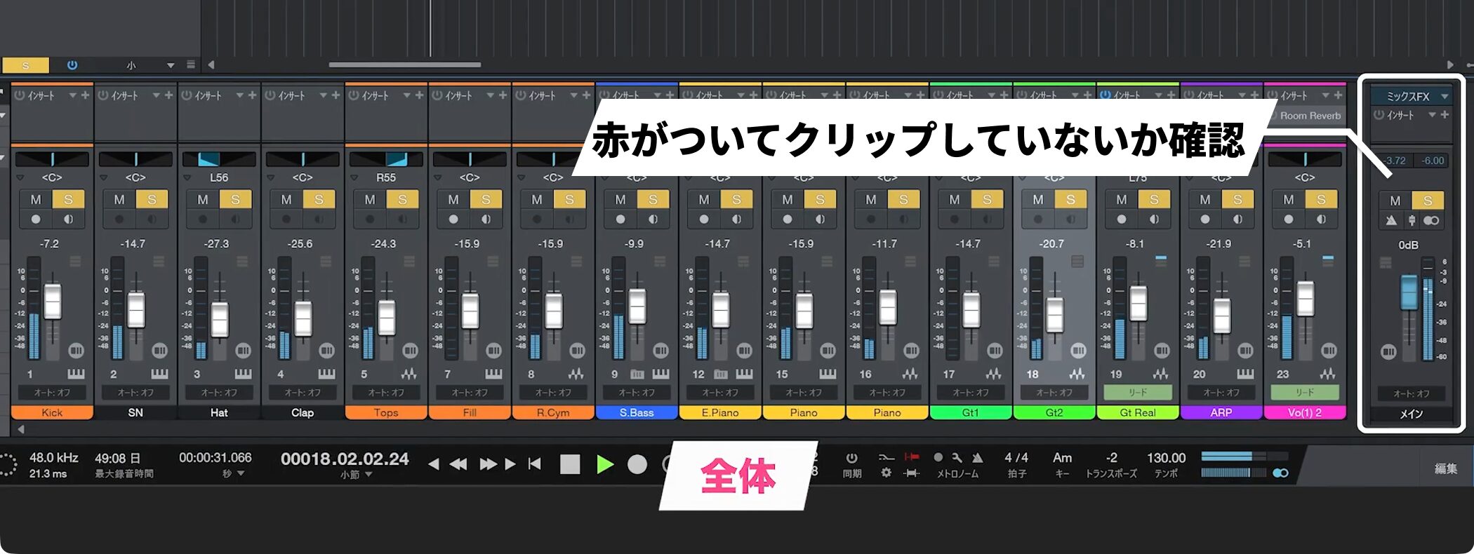 全トラックを再生した際に、マスタートラックで赤がついてクリップしていないかを必ず確認しましょう。