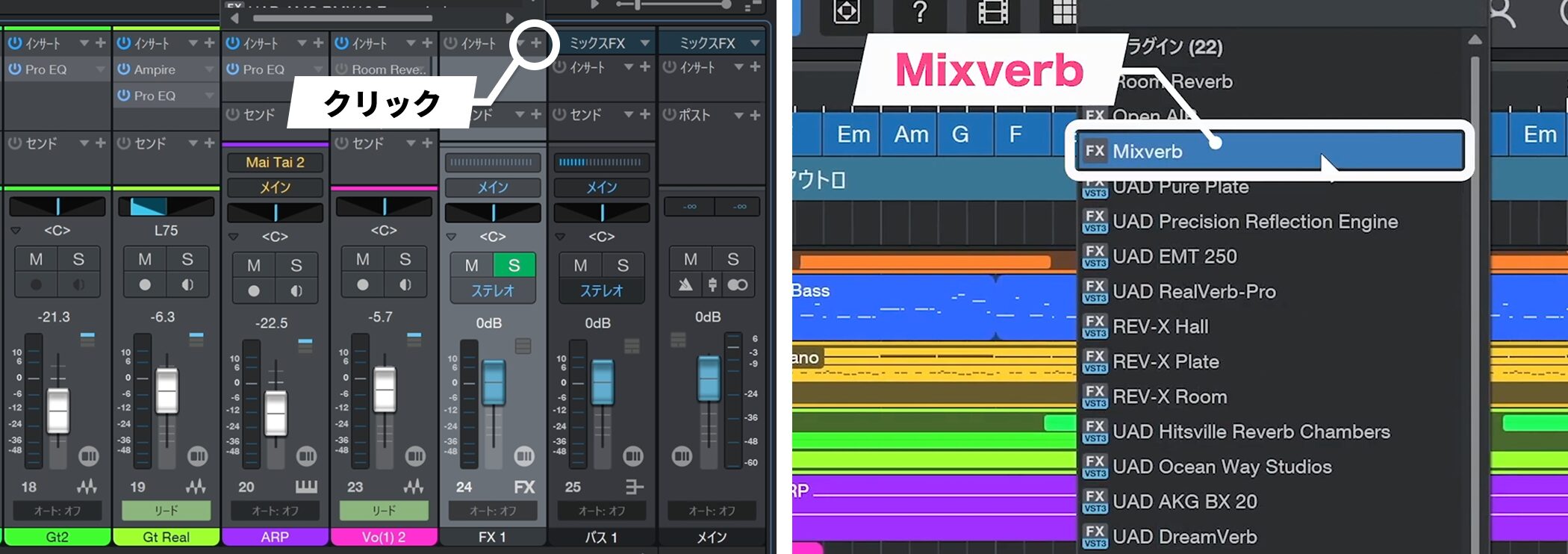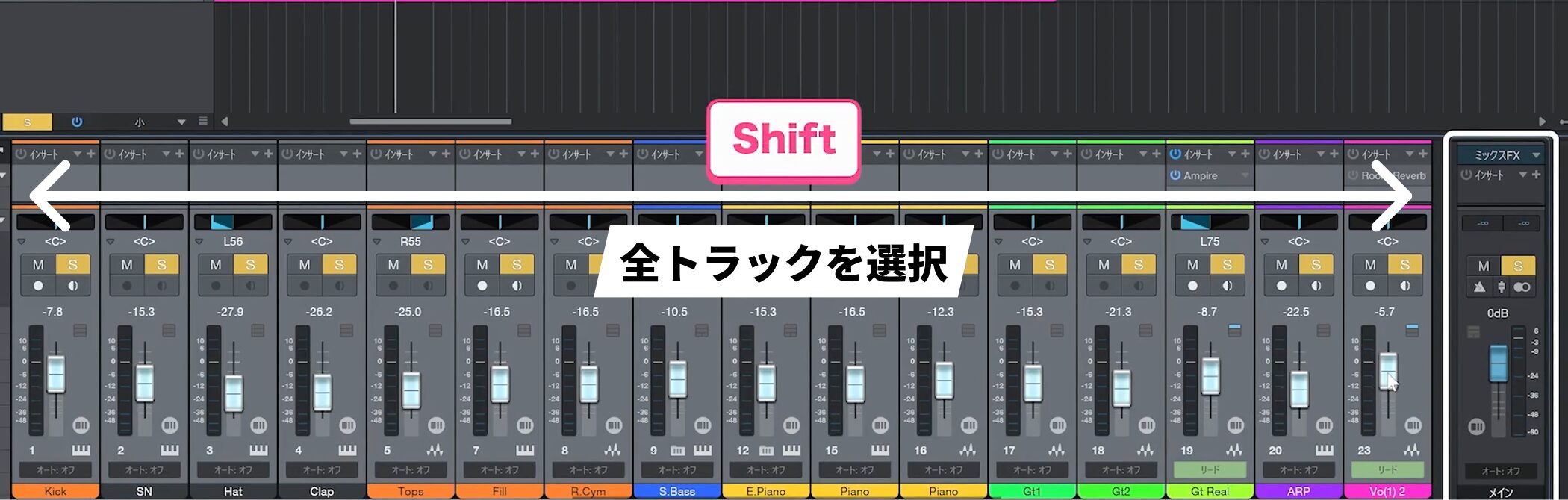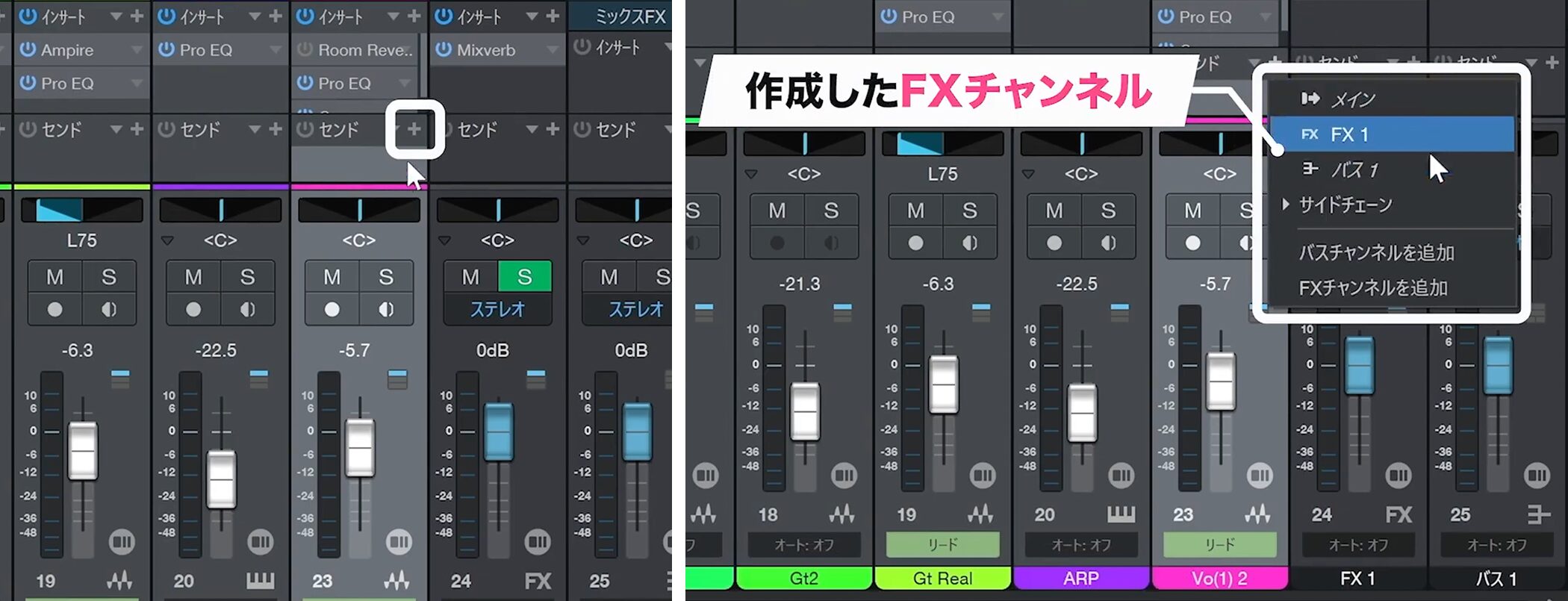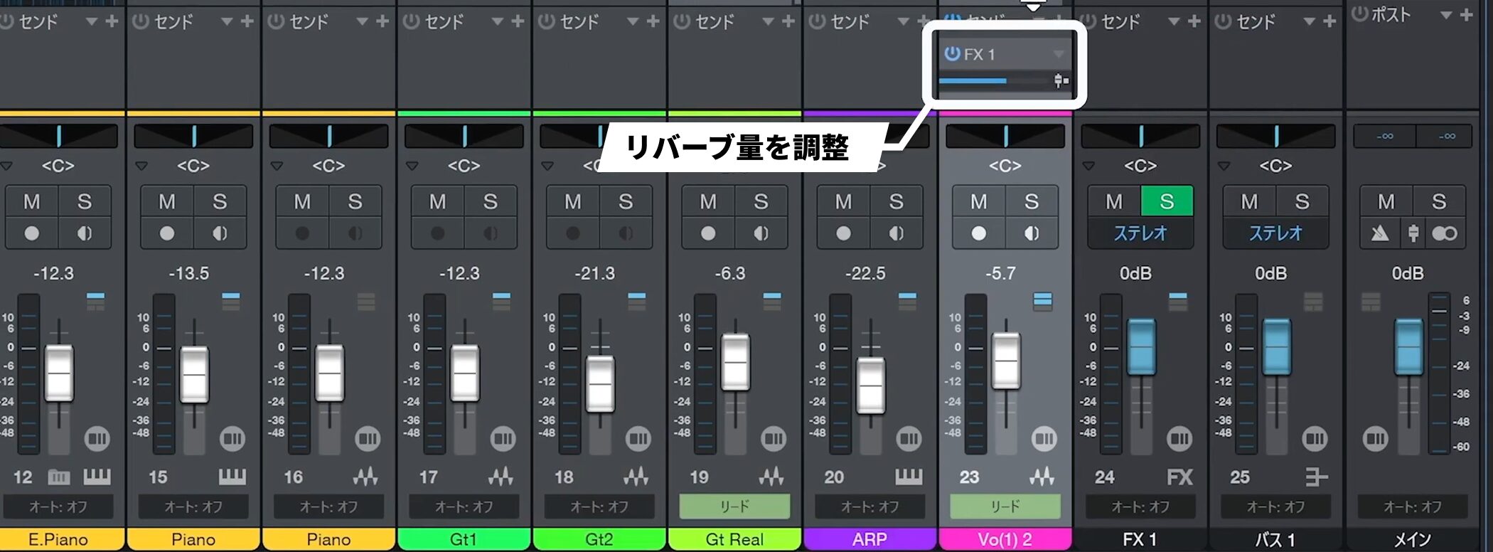 リバーブのような空間エフェクトは、FXチャンネルを使った方が効率的に進められます。