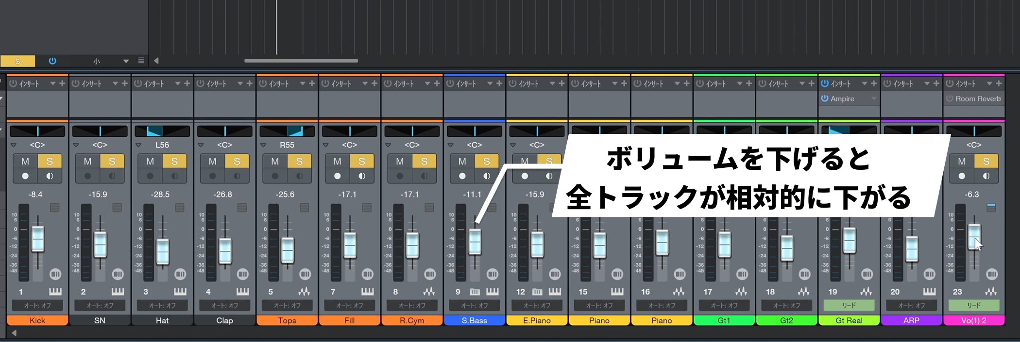 どれか一つのボリュームを下げると、全てのトラックが連動して、相対的にボリュームを変化させることができます。
