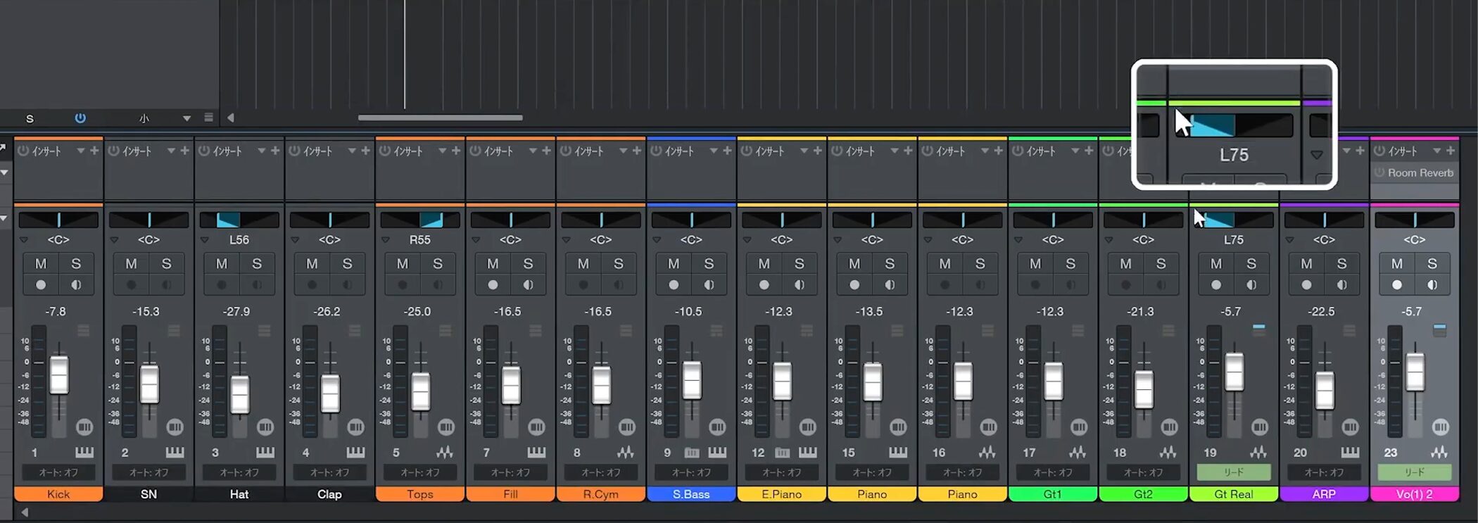 ボリュームバランスを取ったら、左右のパンを調整します。