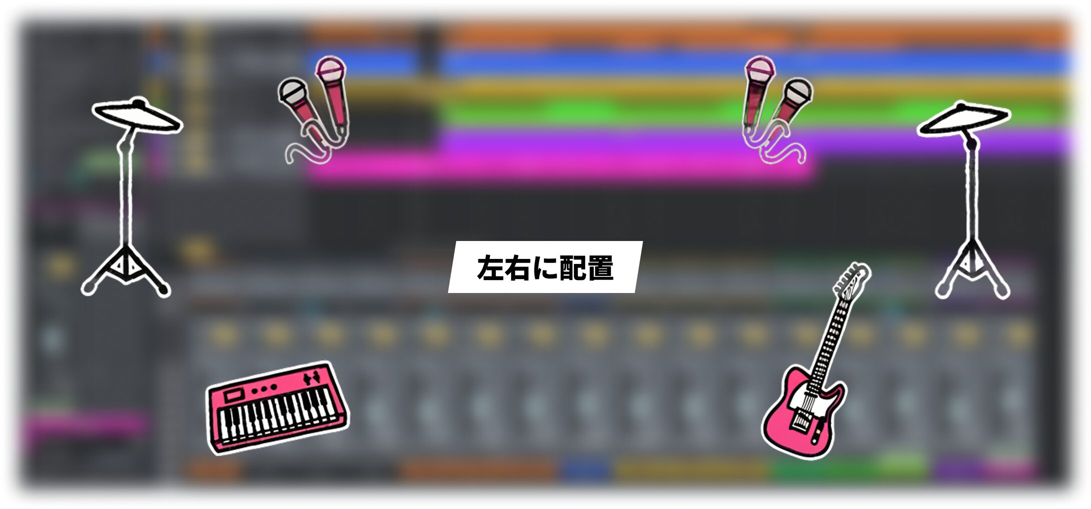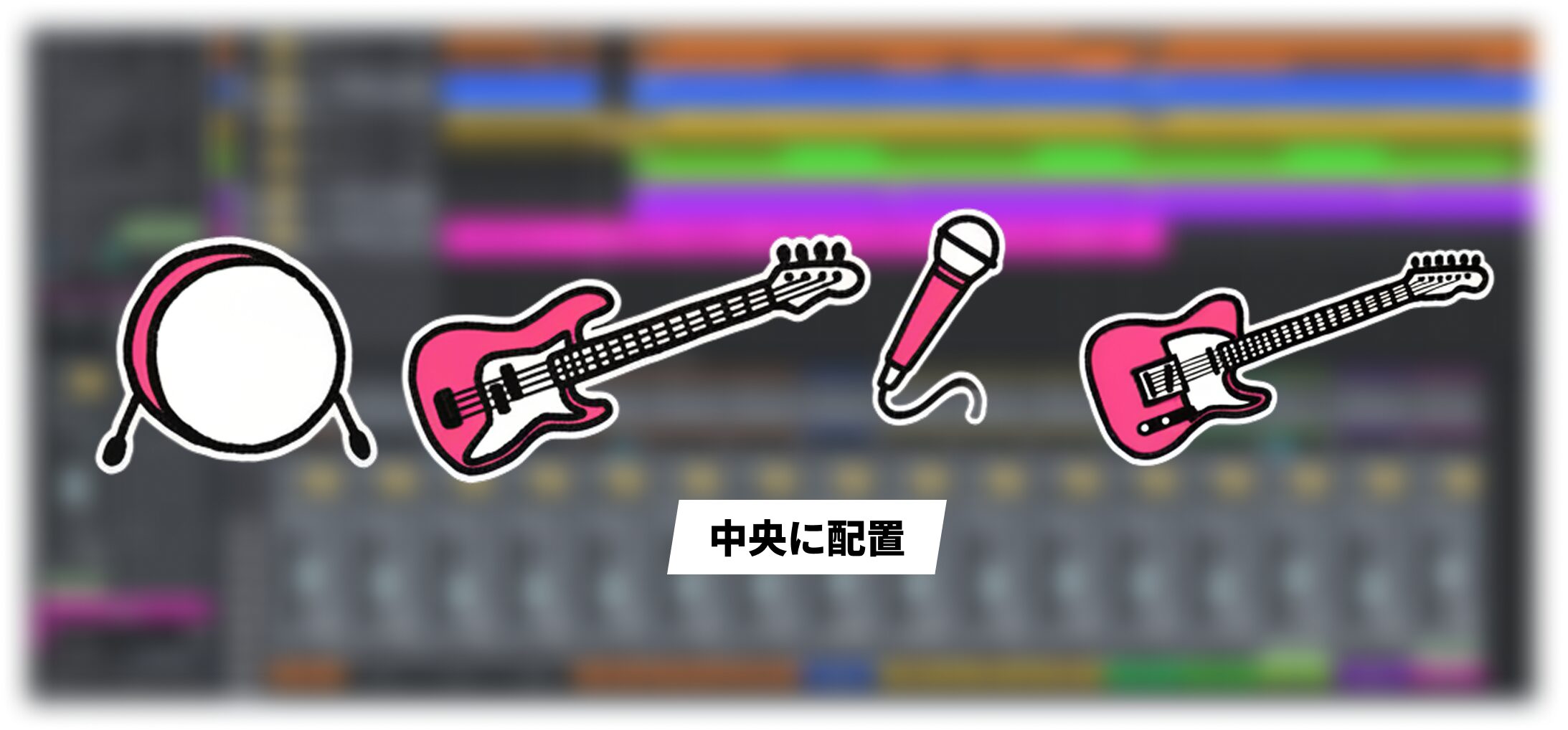 ベースやキックのような低域が強く曲の土台となるもの、またメインボーカルやギターソロなど楽曲の顔になるものは中央に配置することが多いです。