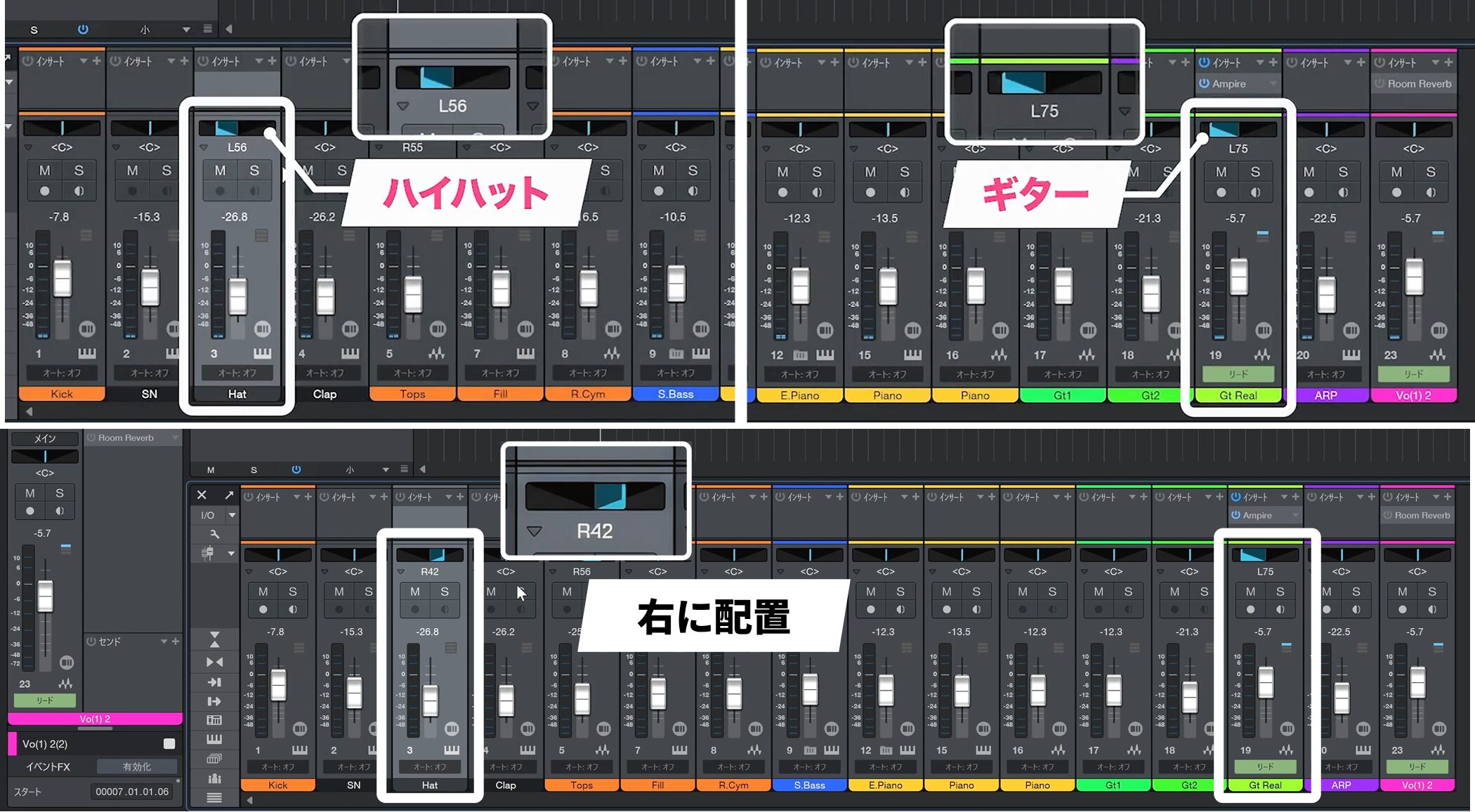 例えば、左にパンを振ったハイハットとギターが被る場合、ハイハットを右に振ると両方が聴き取りやすくなります。