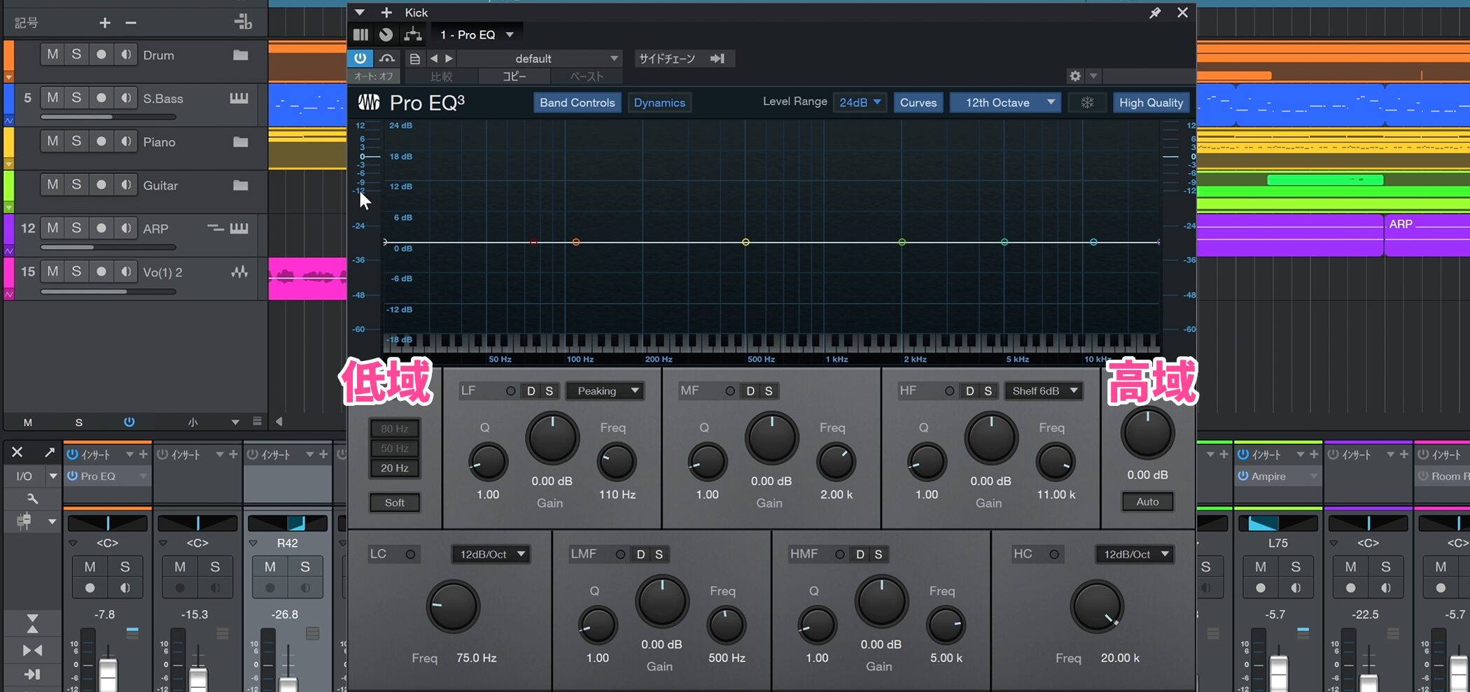 調整したキックやベースに対して、ここも大きくならないように聴きながら調整します。