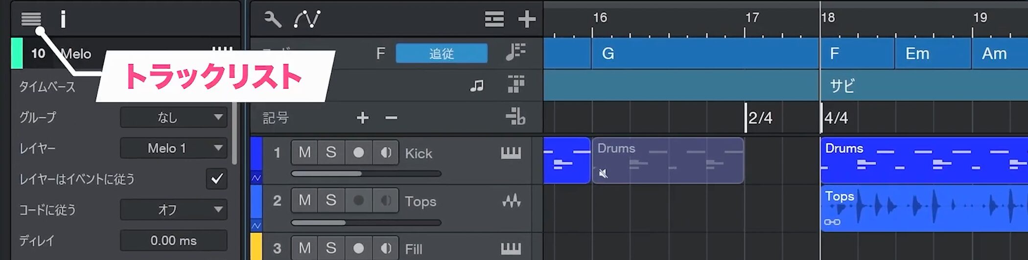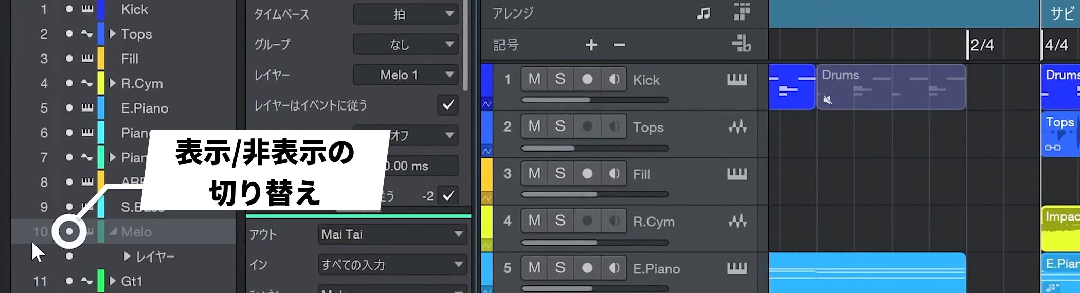 対象トラックの白いポイントをクリックすると、表示と非表示を切り替えることができます。