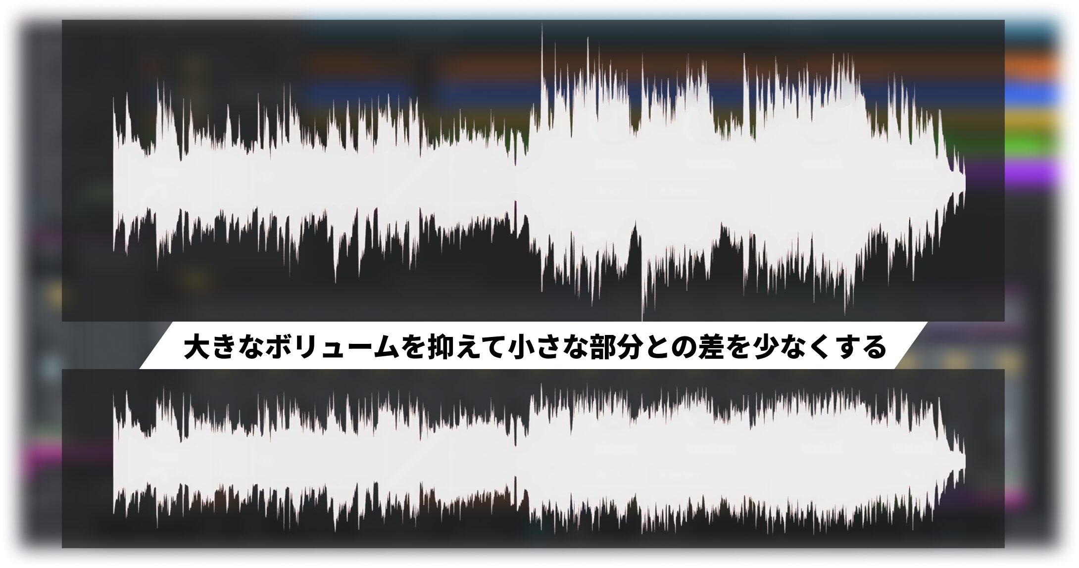 コンプレッサーはボリュームをコントロールするエフェクトで、トラックの中の大きな部分を抑えて小さな部分との差を少なくします。