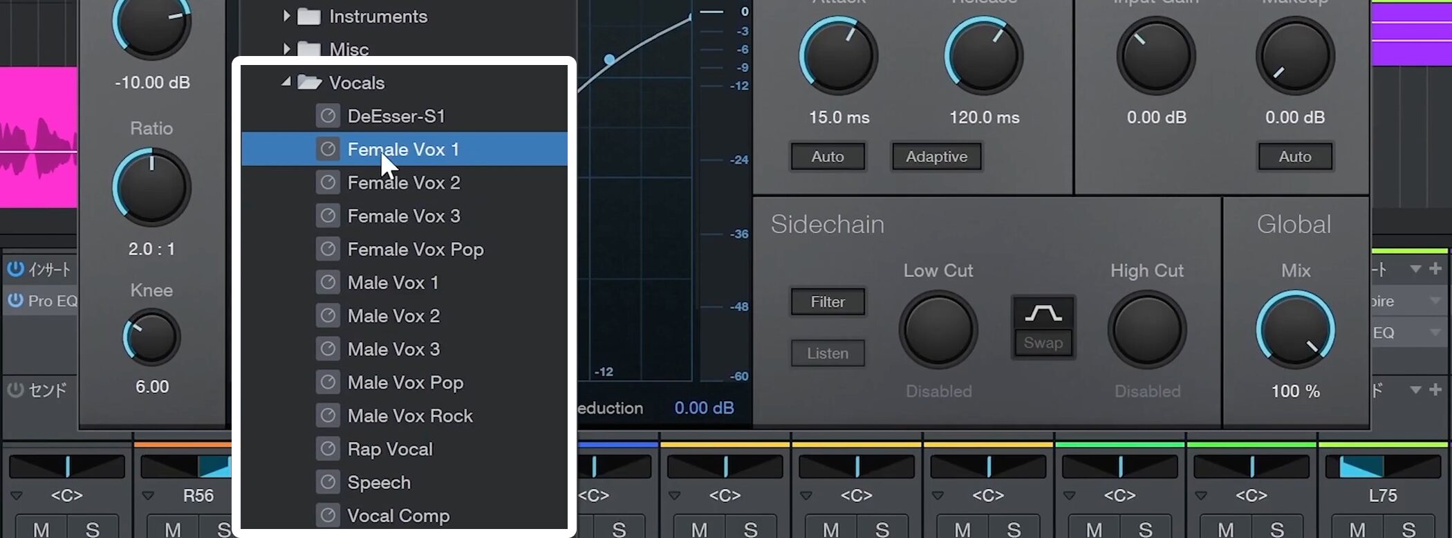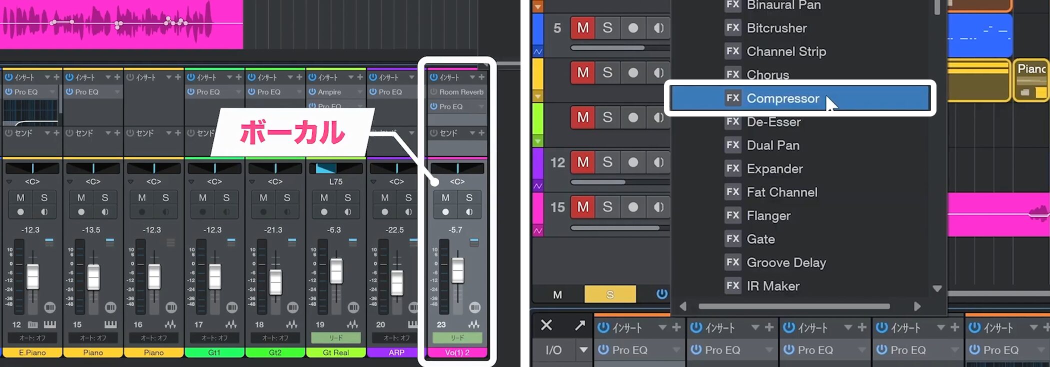 ここでは特に音量ムラを抑えたいボーカルトラックに「Compressor」を挿入します。