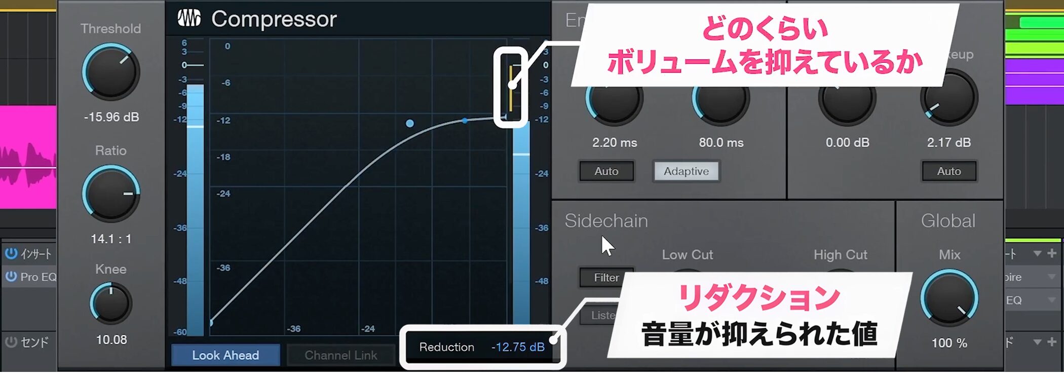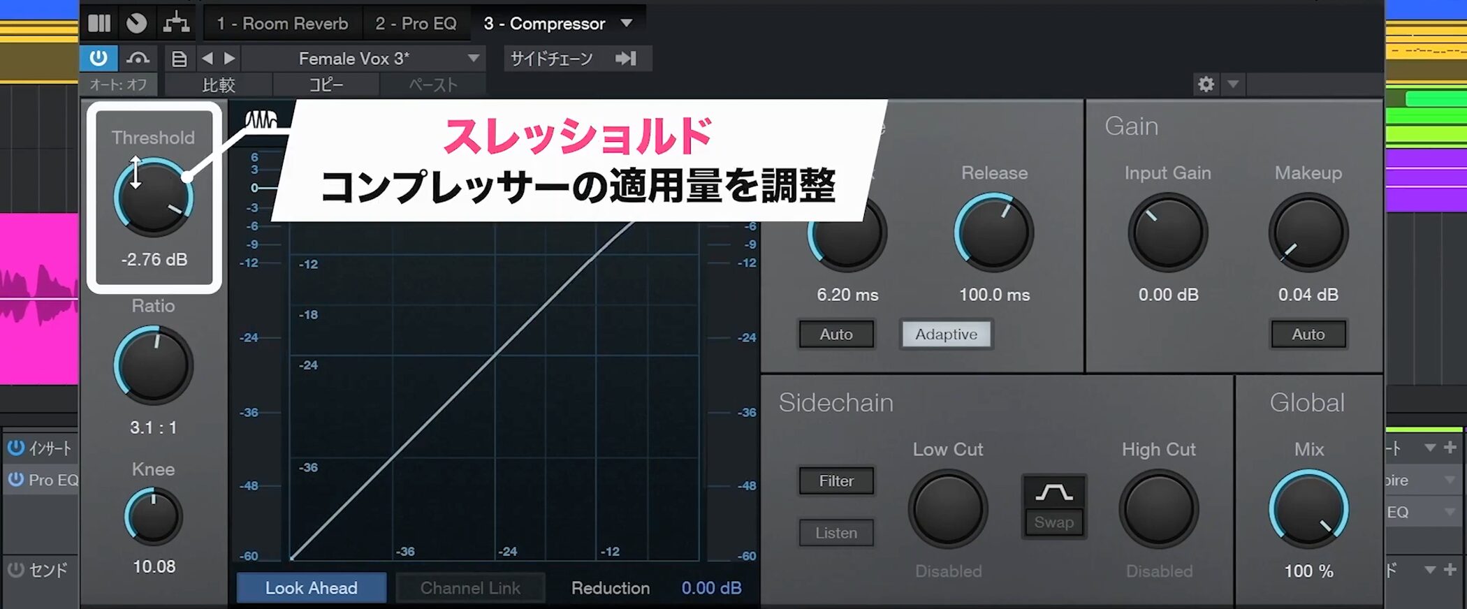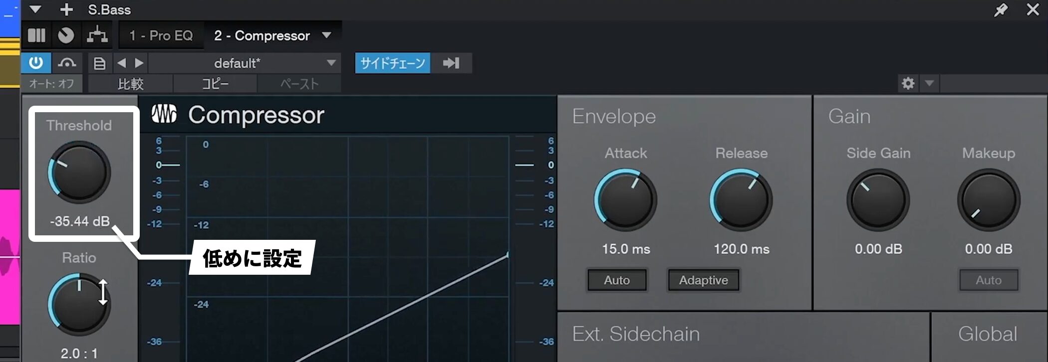 サウンドが不自然な場合は「Threshold」を回してコンプレッサーの適用量を調整しましょう。