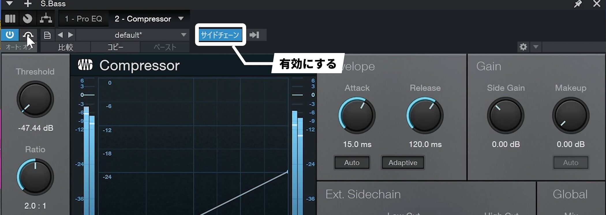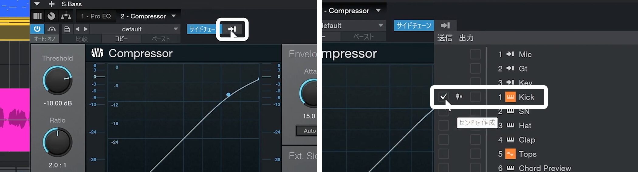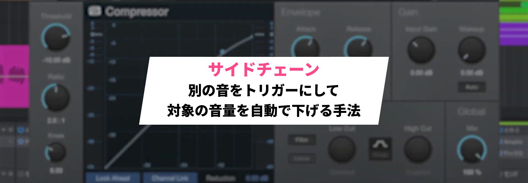 サイドチェーンは、別の音をトリガーにして、対象の音量を自動で下げる手法です。
