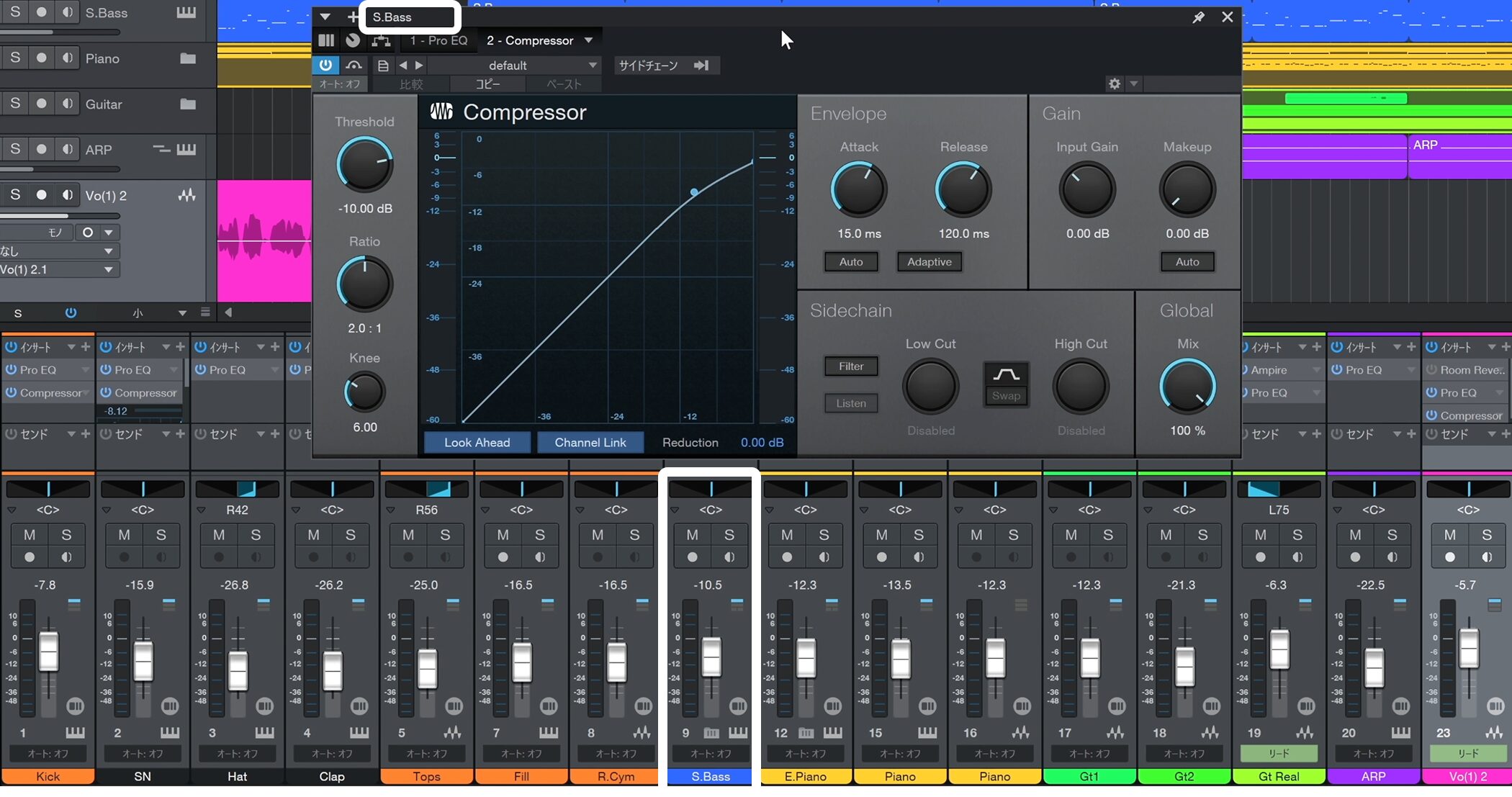 続いてミキシングで多用されるコンプレッサーを適用します。