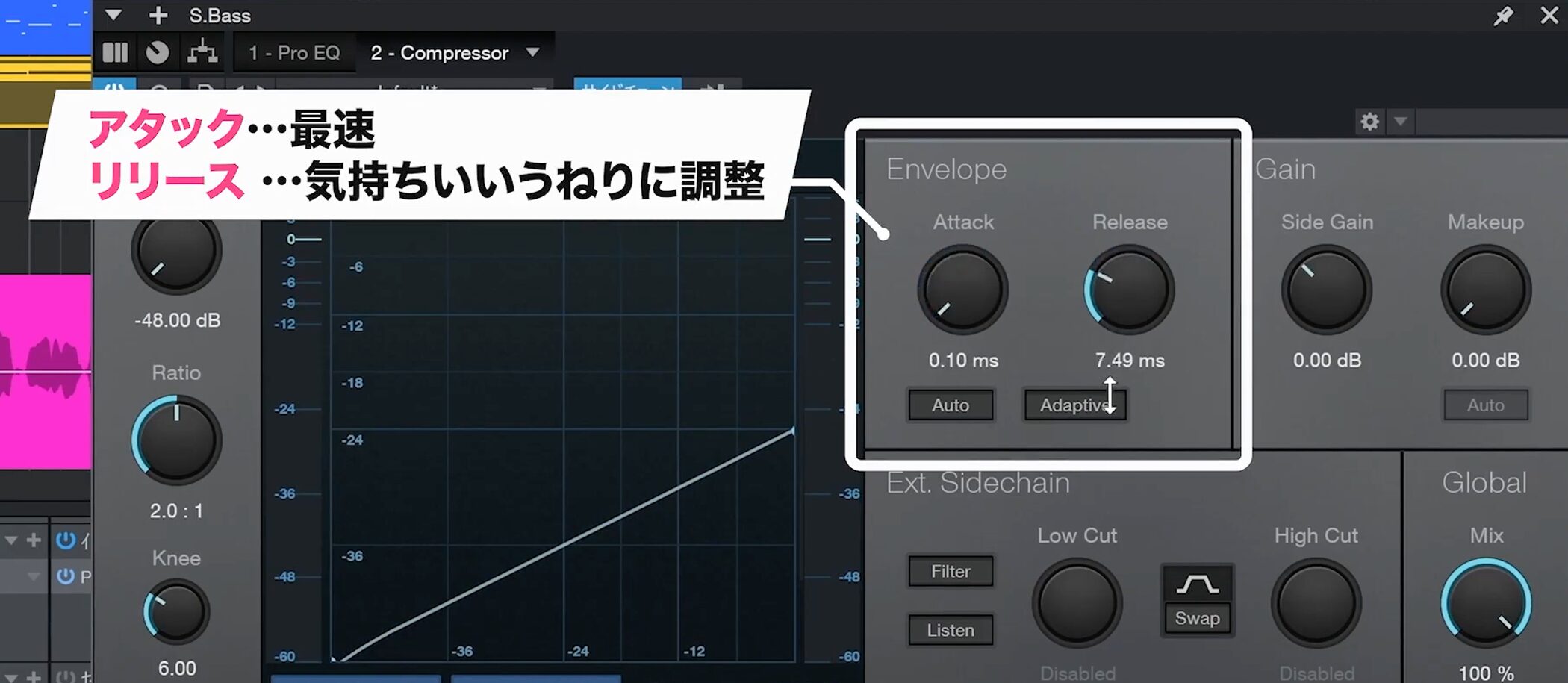 設定のコツとして、「Envelope」で「Attack」を最速にし、「Release」で気持ちの良いうねりになるように微調整します。