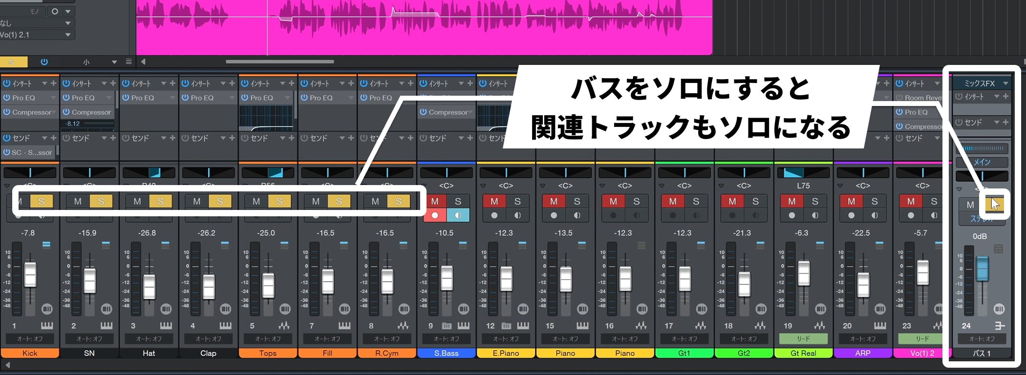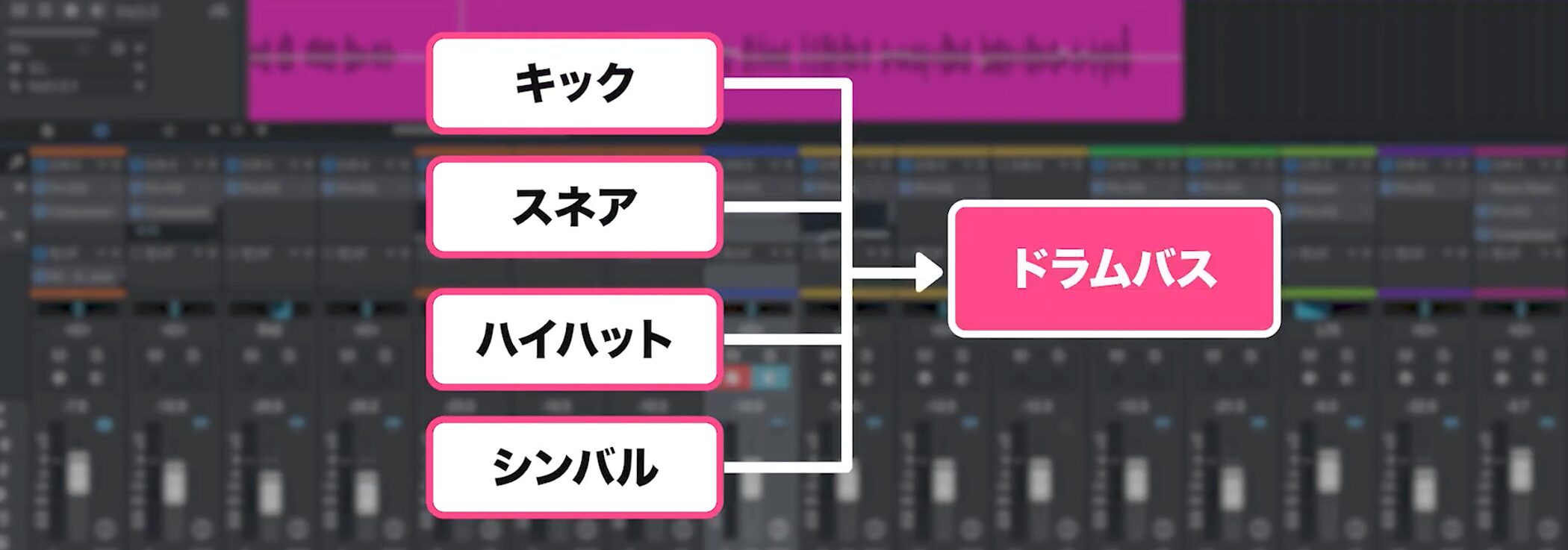 バスチャンネルは、例えばドラムのようにキック・スネア・ハット・シンバルなど複数のチャンネルがあるものを一つにまとめることができます。