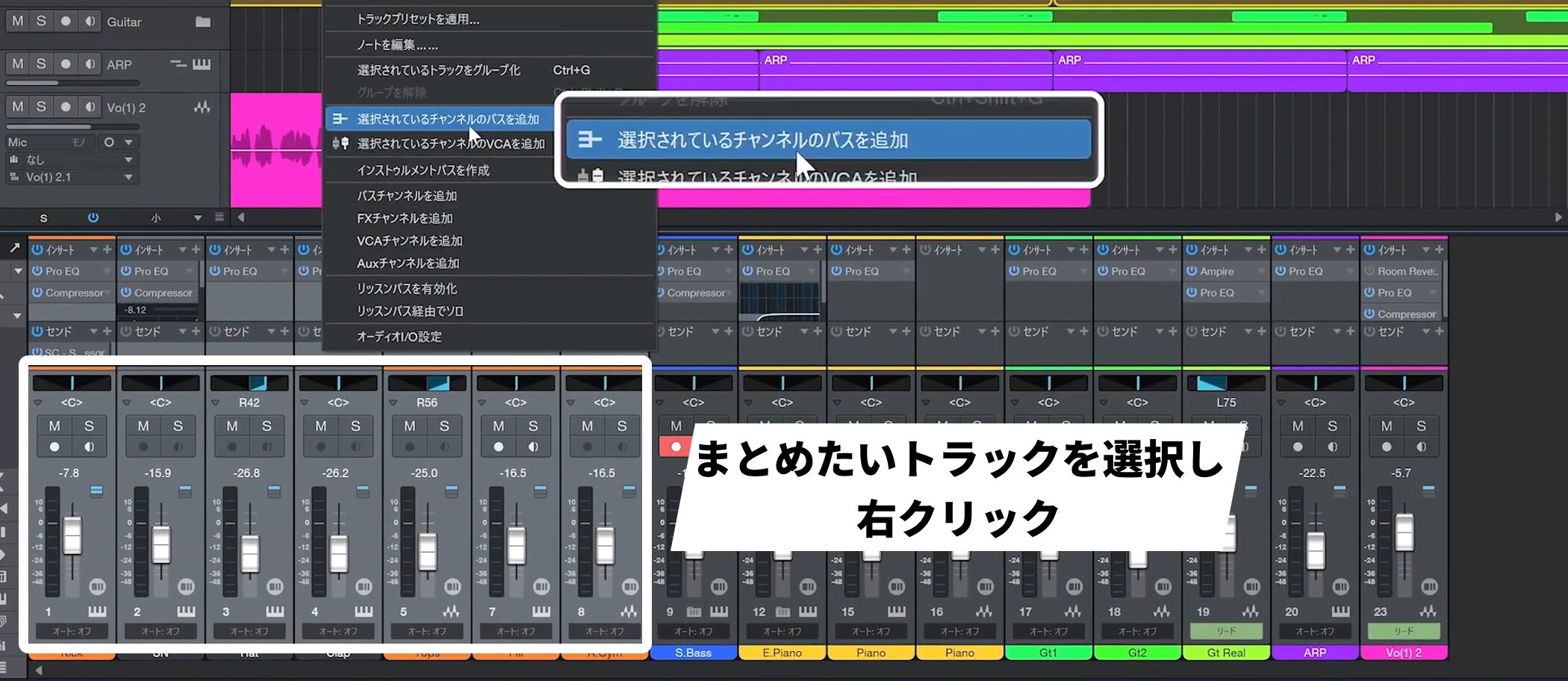 メニューの中の「選択されているチャンネルのバスを追加」を選択します。