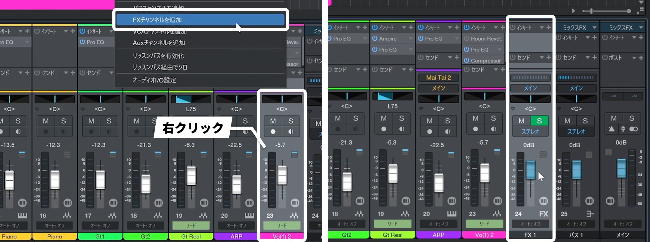 ミキサーの空き部分を右クリックして「FXチャンネルを追加」を選択します。
