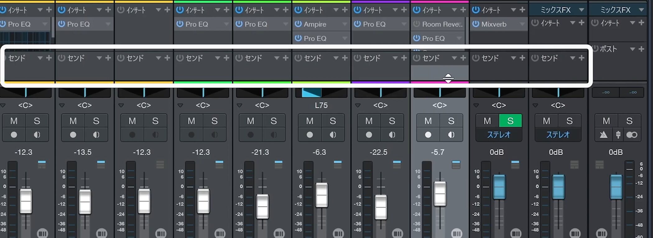 各チャンネルの「センド」を使ってFXチャンネルへ送ります。