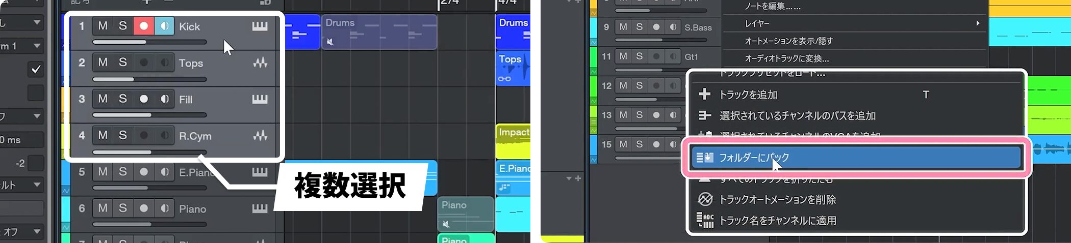 まとめたいトラックを複数選択して右クリックし、メニューの中から「フォルダーにパック」を選択します。