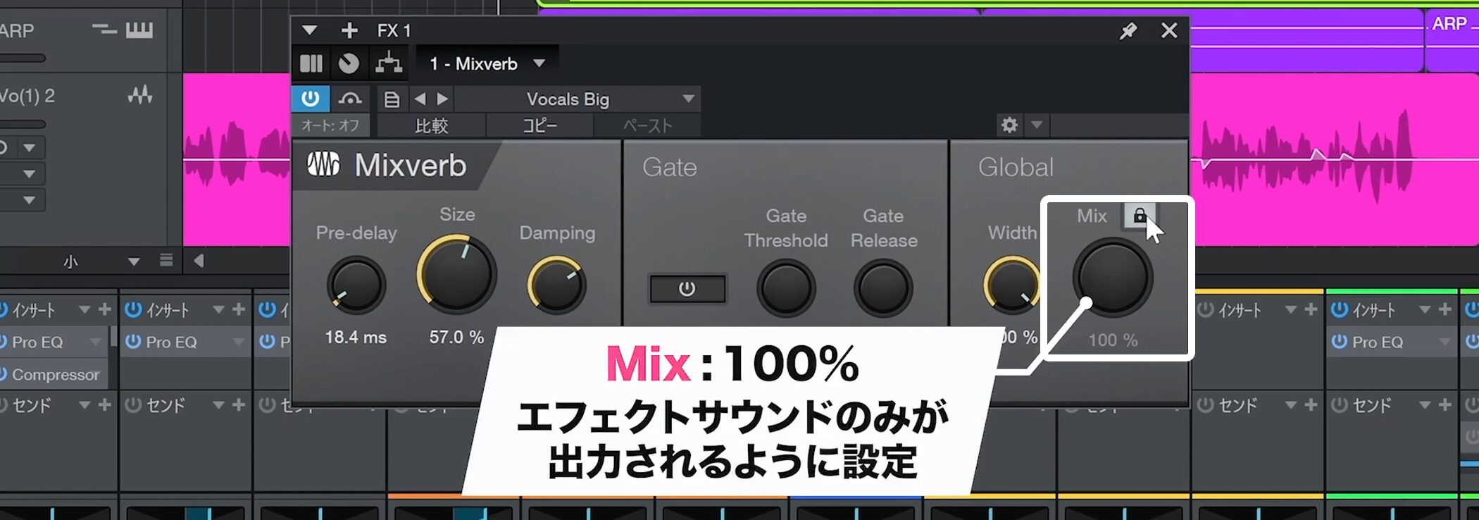 FXチャンネルはエフェクト音のみを担当するため、Mixは100%(ウェットのみ)に設定するのが基本です。