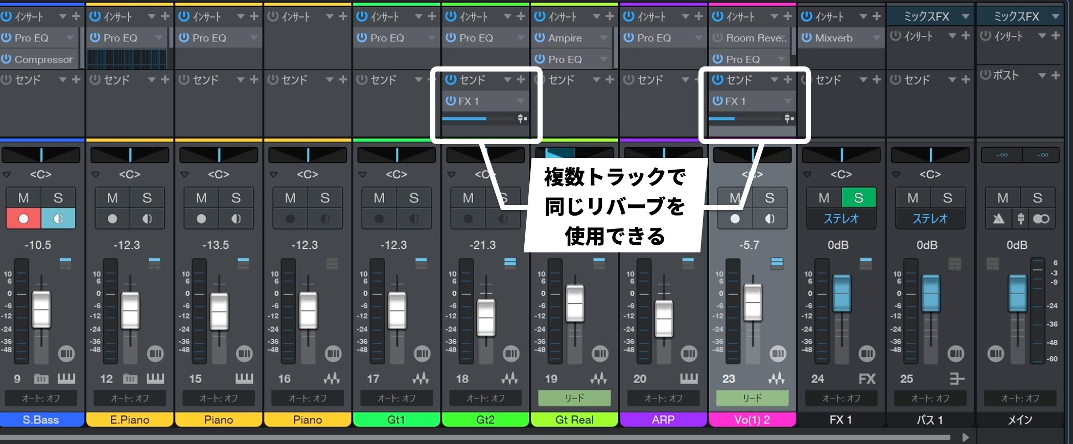また、FXチャンネルのメリットは他のトラックからも同じリバーブにアクセスできることです。