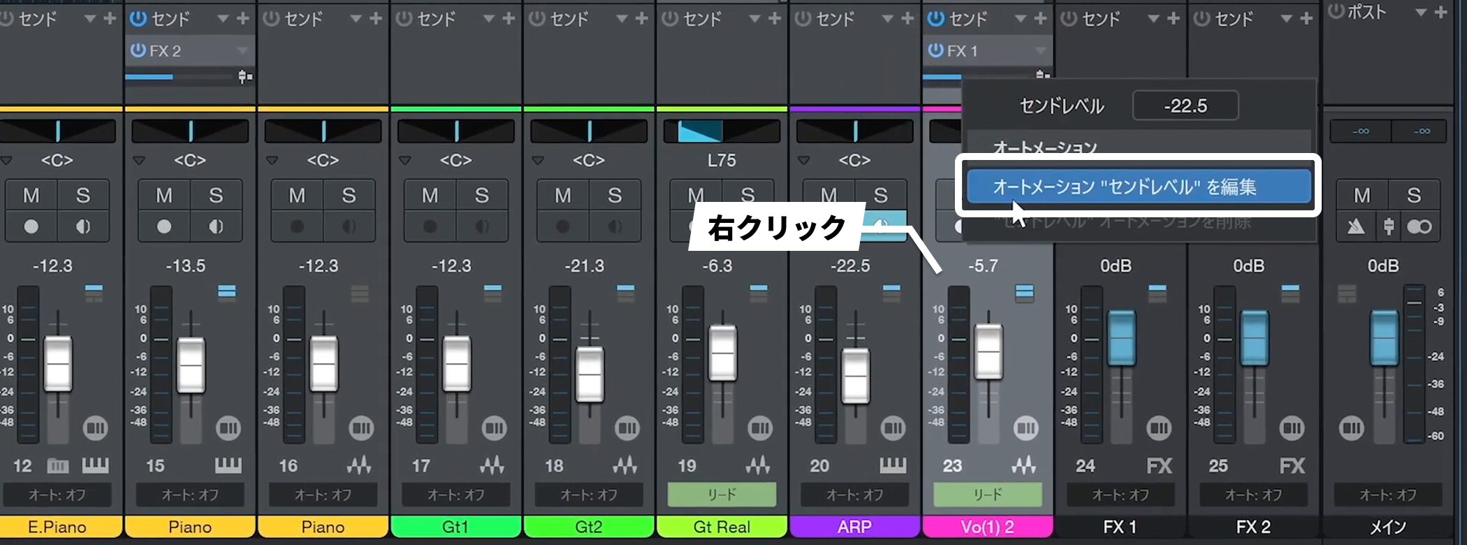 目的のパラメータを右クリックし、メニューの中から「オートメーション”センドレベル”を編集」を選択します。