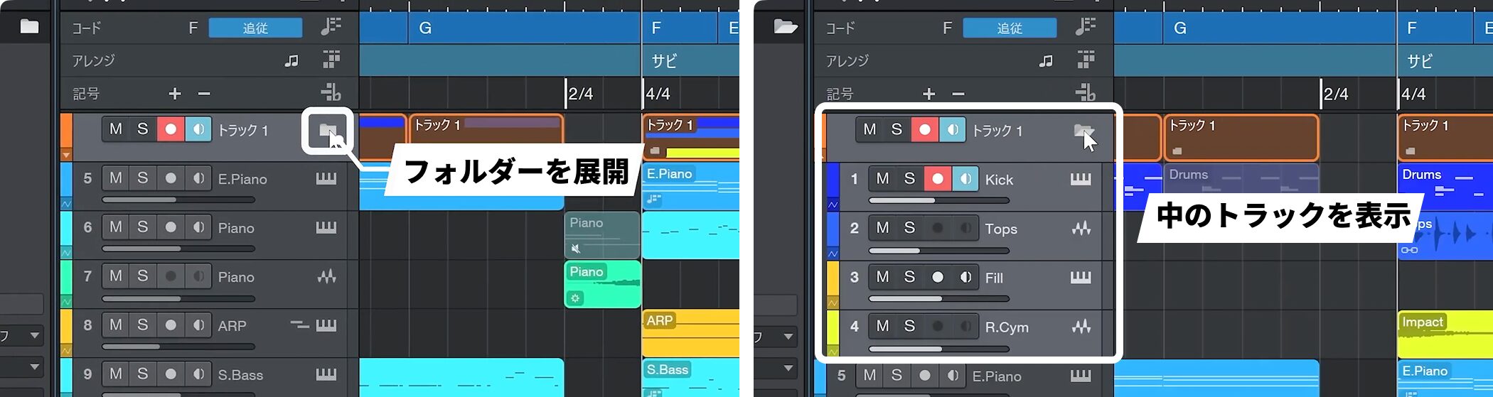 フォルダーアイコンをクリックすると中のトラックを表示できます。