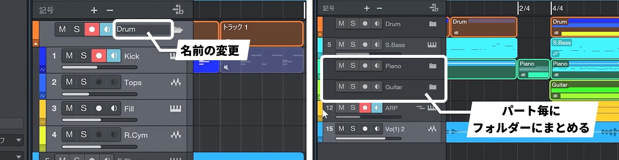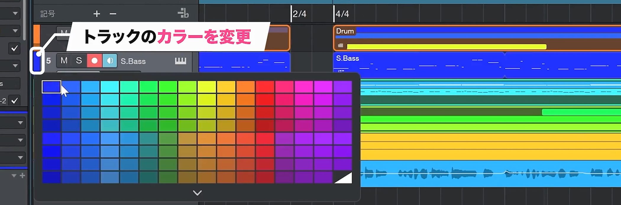 カラーに決まりはなく自由につけられますが、ご自身の中で「ベースは青」「鍵盤は黄色」など決めておくと、楽曲が変わってもすぐにトラックを見つけることができます。