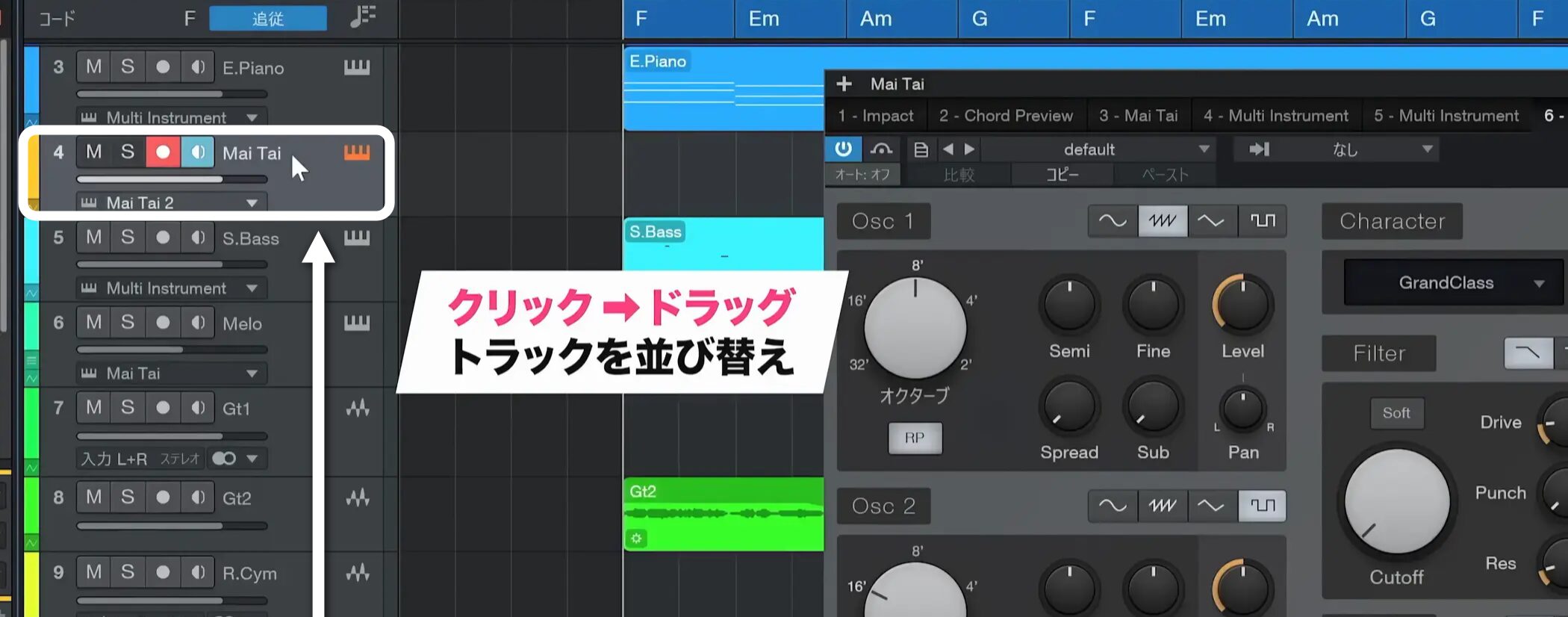 トラックをドラッグすることで並び替えを行い、作業しやすい順序に調整できます。