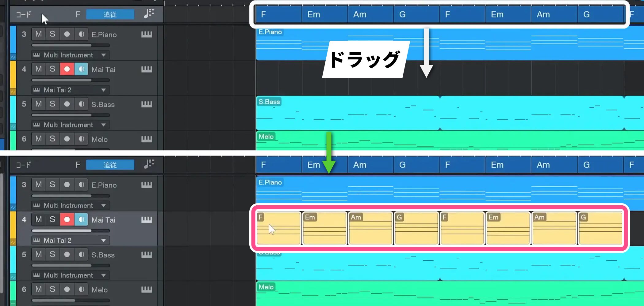 現在のコード進行をそのまま活用するため、コードを選択してトラックに移動します。