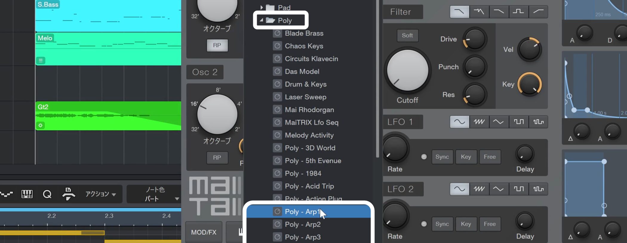 音色選択では「Poly」カテゴリの中にアルペジオ専用の音色があるため、これを活用します。