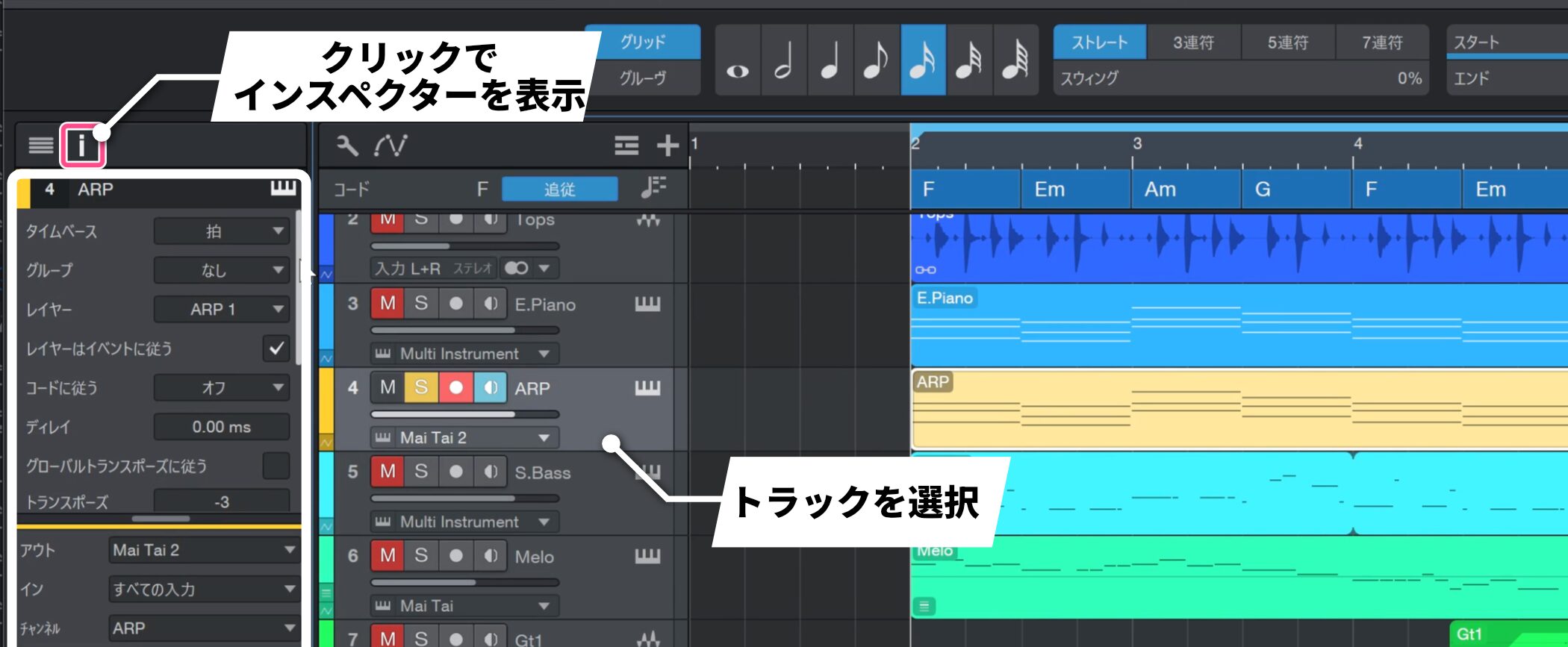 対象のトラックを選択し、左側の「インスペクター」を開きます。