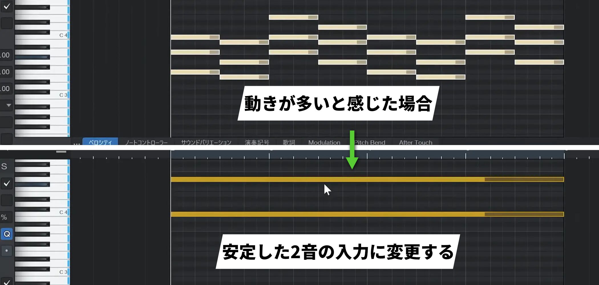 アルペジエイターで動きが多すぎると感じた場合は、スケール内の安定したノートを共通で使い続けるテクニックが効果的です。