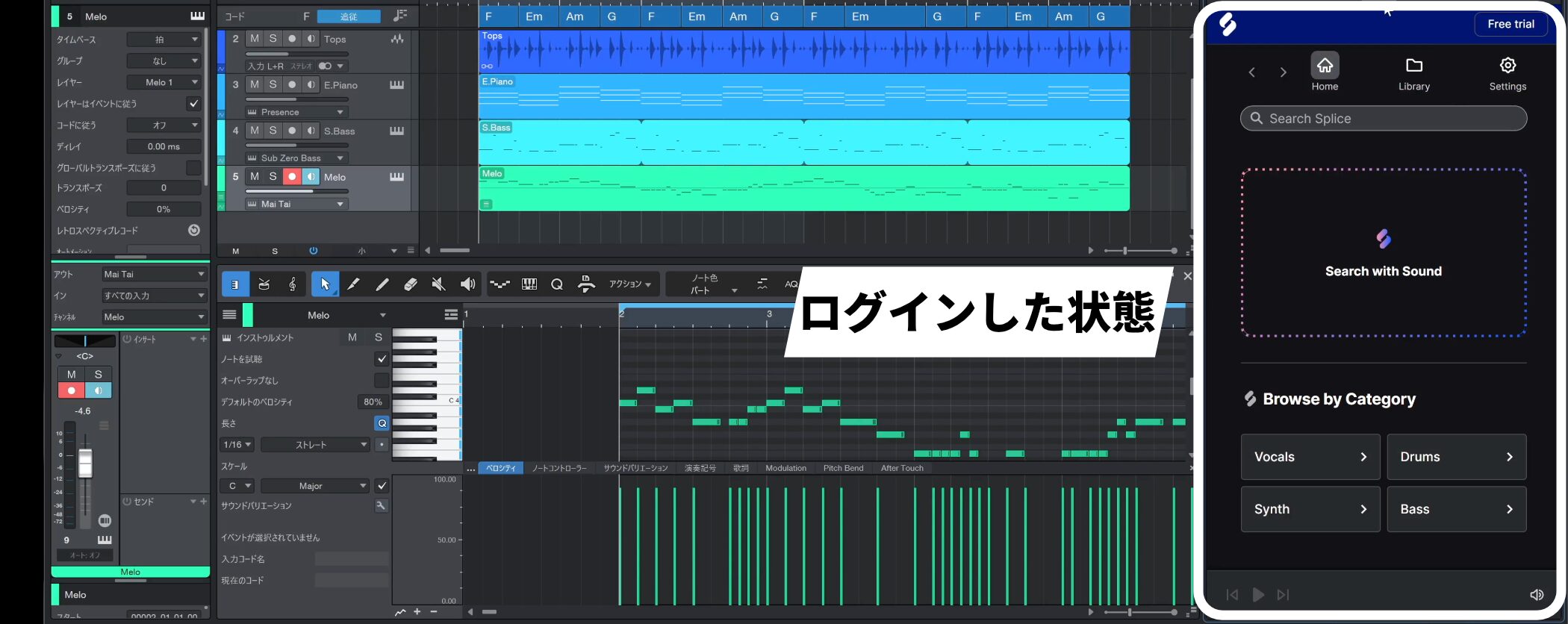 Studio Oneに戻ると、ログインした状態でSpliceサービスが利用可能になります。
