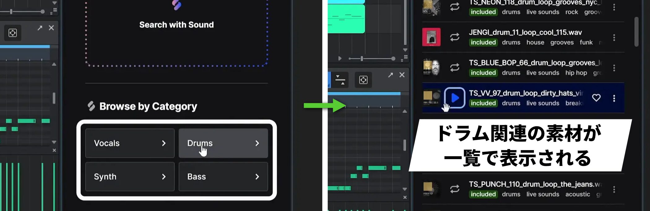 例えば「ドラム」カテゴリーを選択すると、ドラム関連の素材が一覧表示されます。