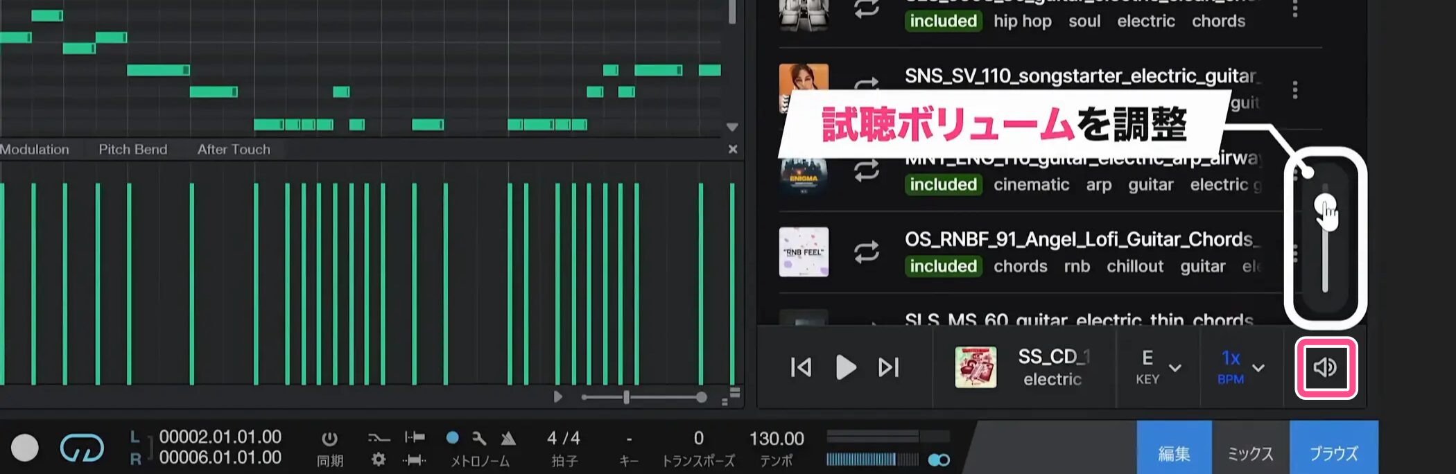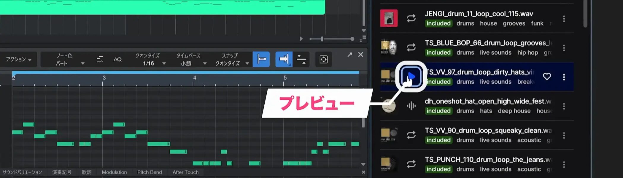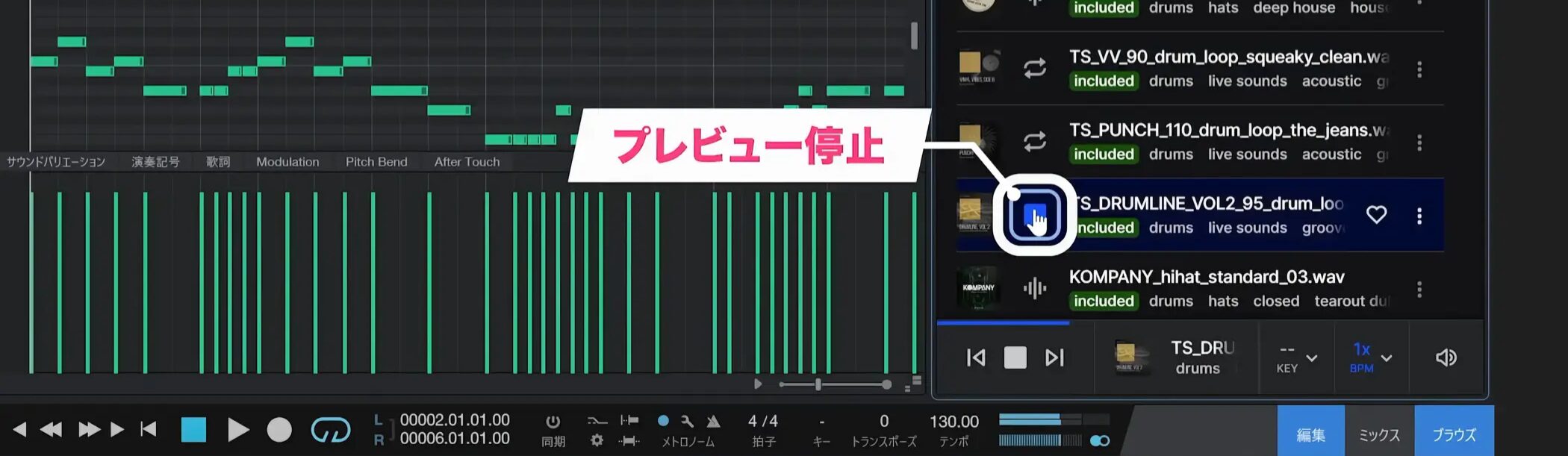 楽曲を再生した後に、気になる素材のプレビューを開始することができます。