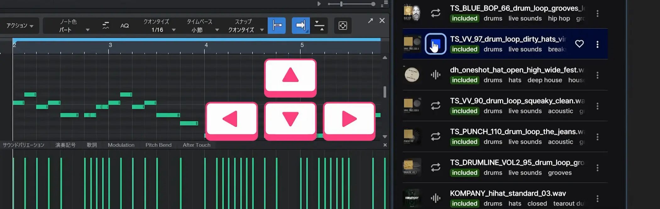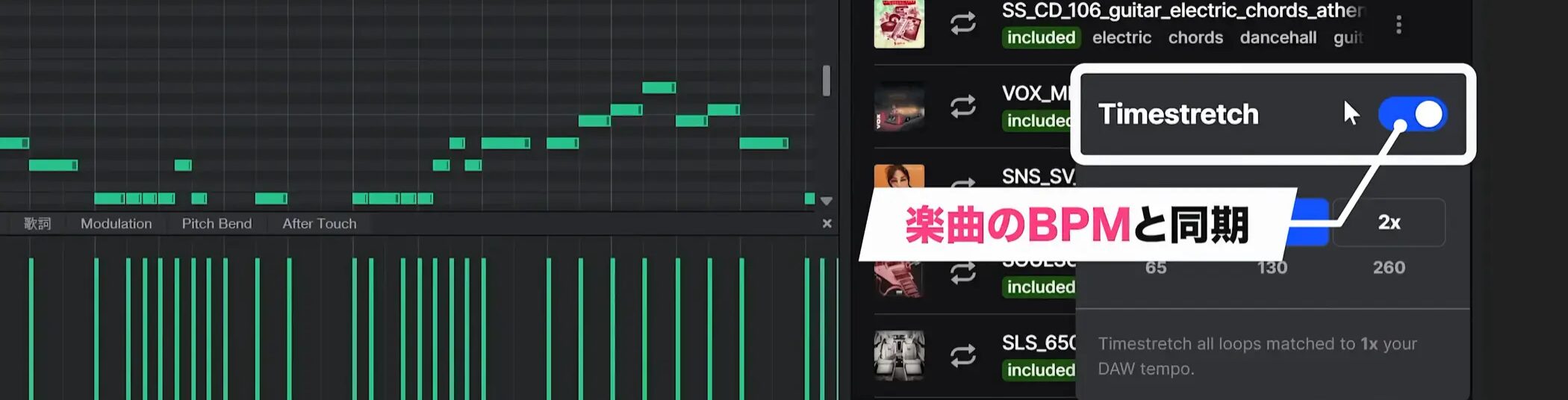 タイムストレッチ機能を活用すると、演奏速度を半分や倍速に変更して、異なるビート感で素材を使用することも可能です。
