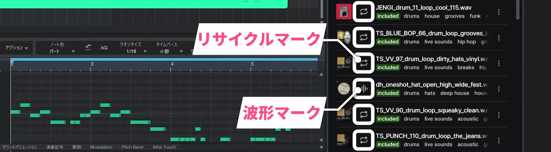 各素材のジャケット右側には、リサイクルマークと波形マークが表示されており、リサイクルマークはループ素材、波形マークは単発素材を示しています。