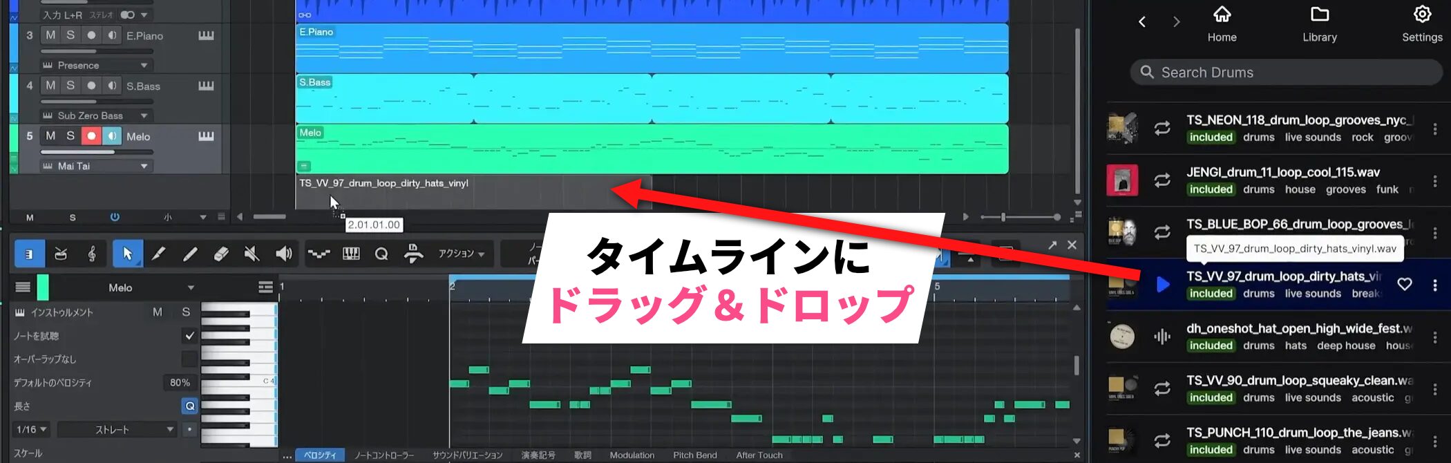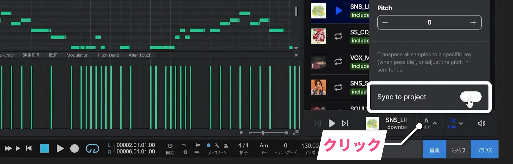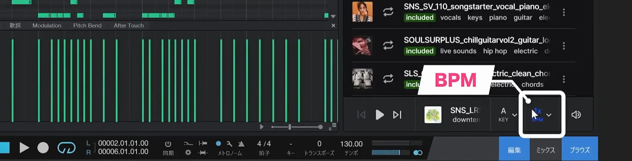 Spliceの素材は、プロジェクトのBPMに自動的に合わせて再生されます。