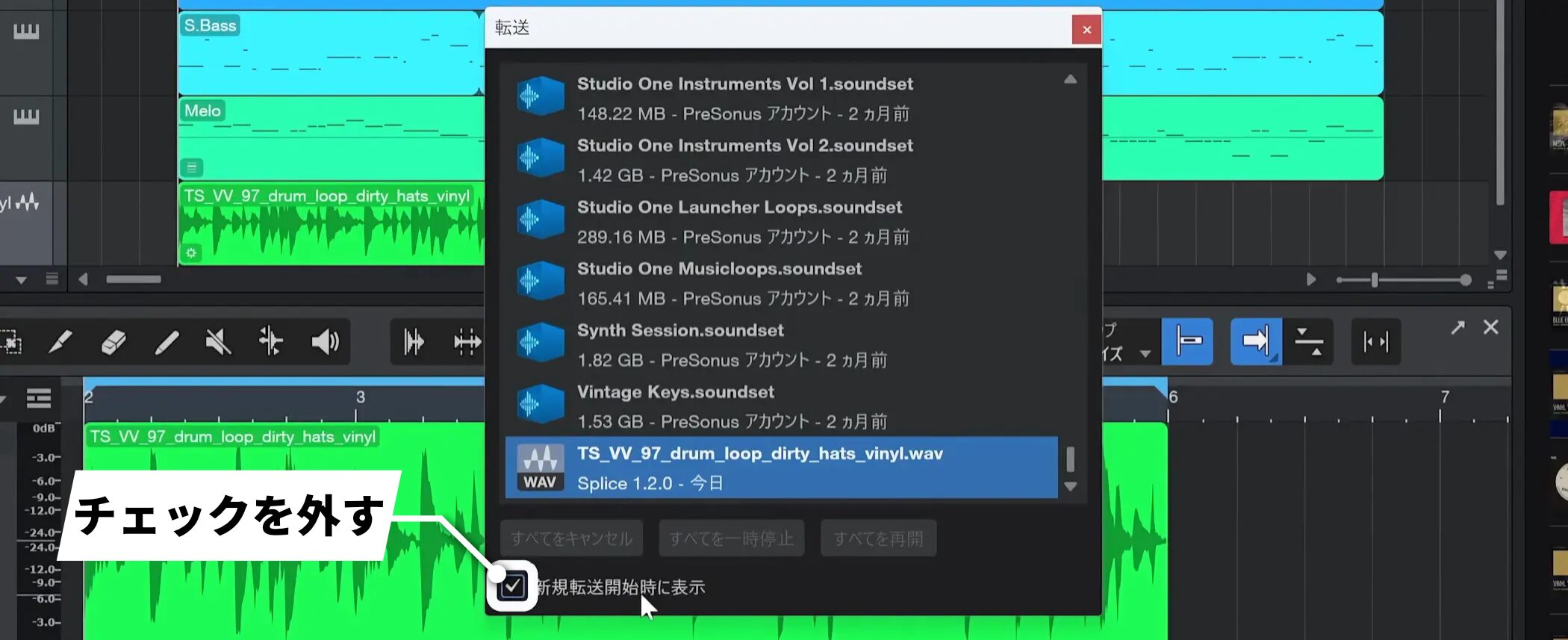 素材の読み込み時に転送ウィンドウが表示される場合がありますが、チェックを外せば次回から表示されません。