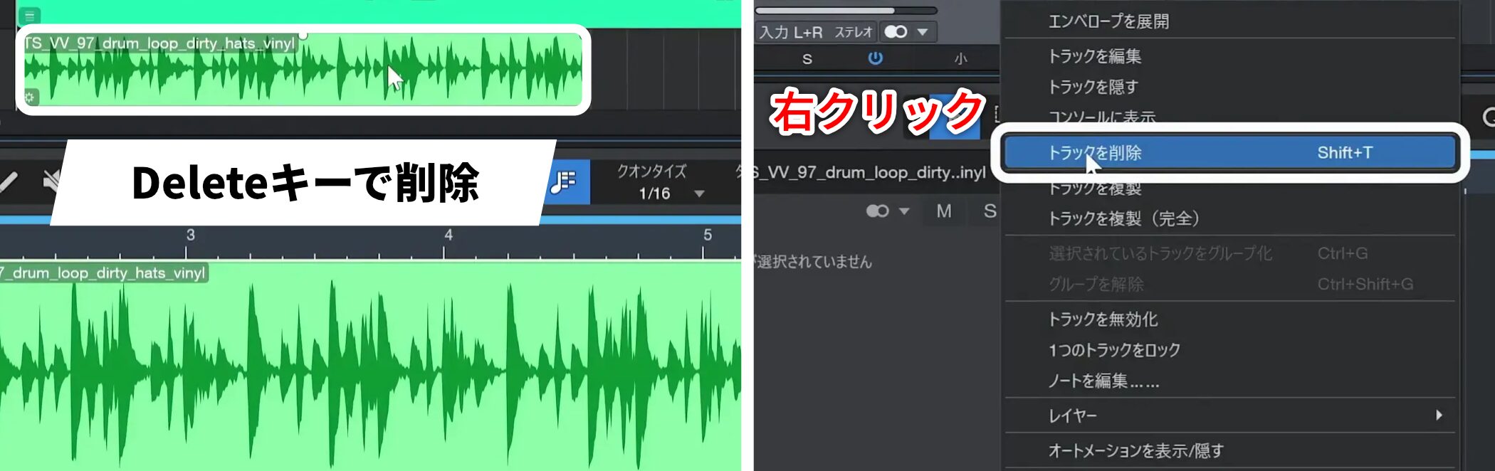 トラック全体を削除したい場合は、トラック部分を右クリックして「トラックを削除」を選択してください。