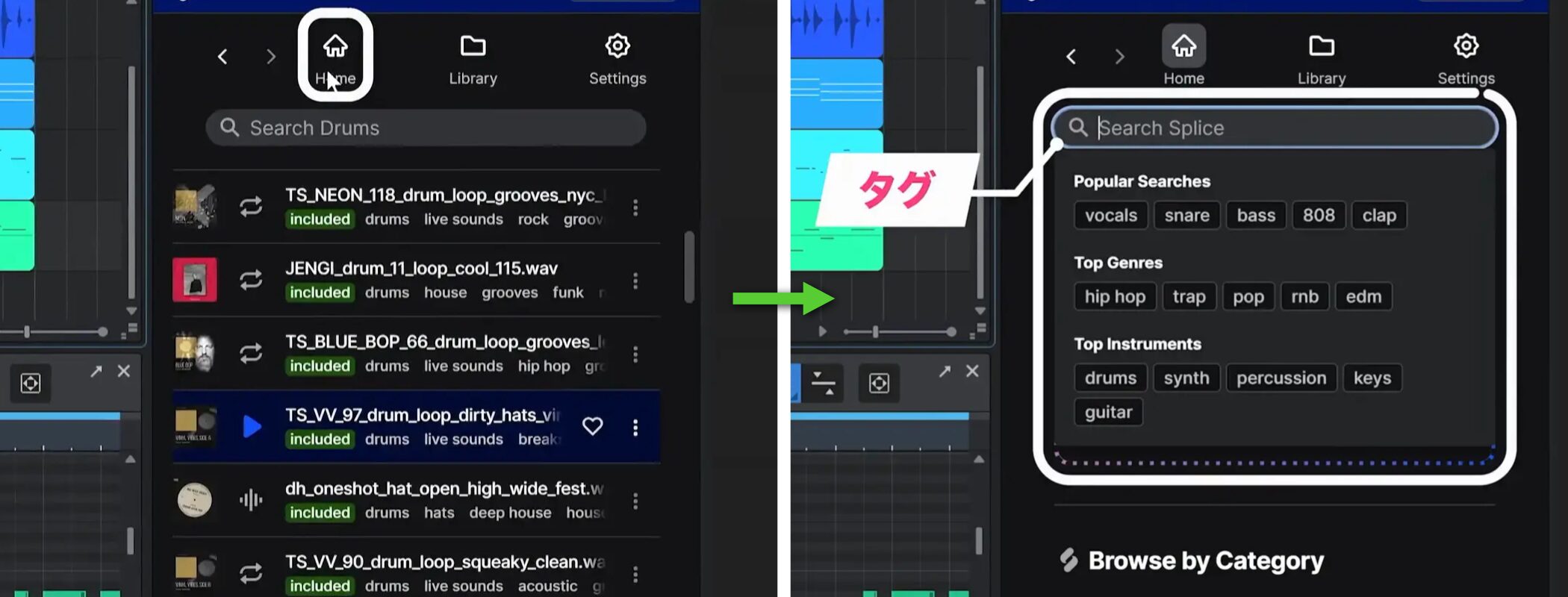 Spliceには、「Search with Sound」という高度な検索機能があり、既存のサウンドファイルをもとに類似の素材を検索できます。