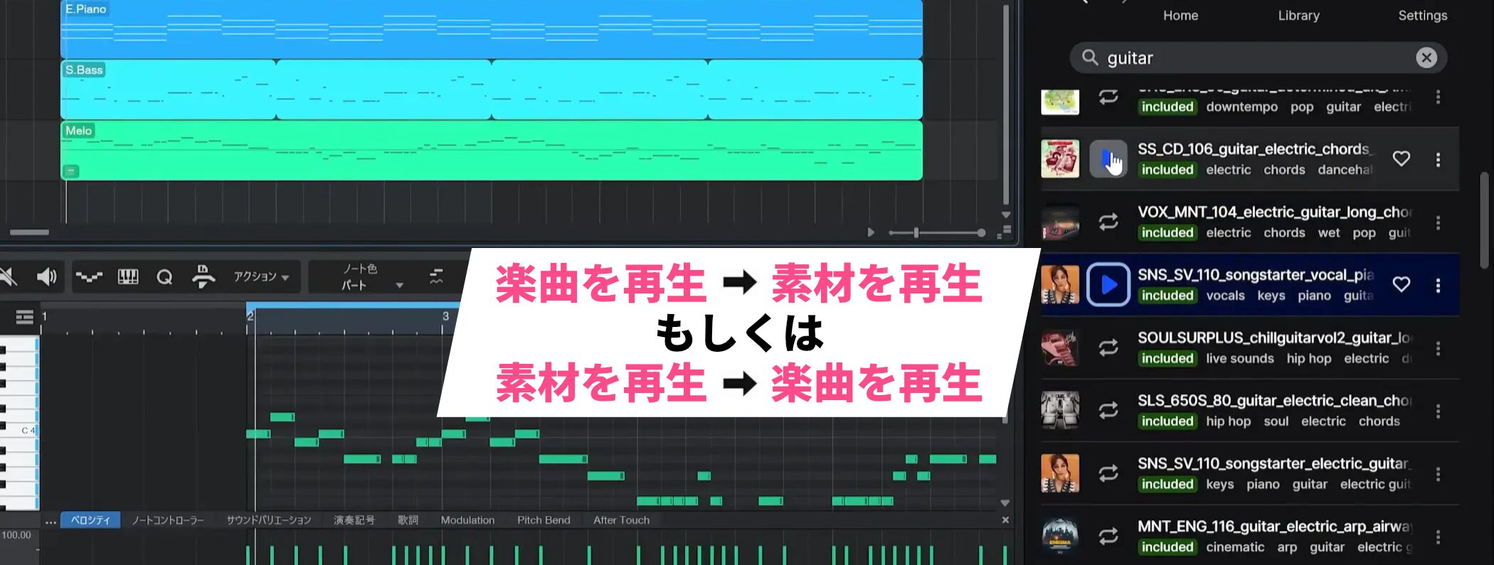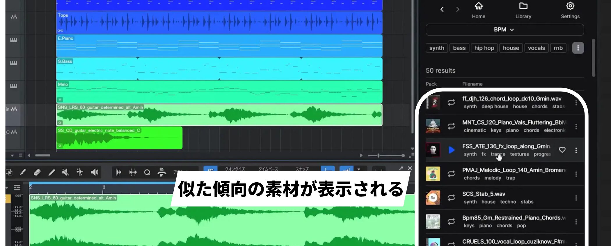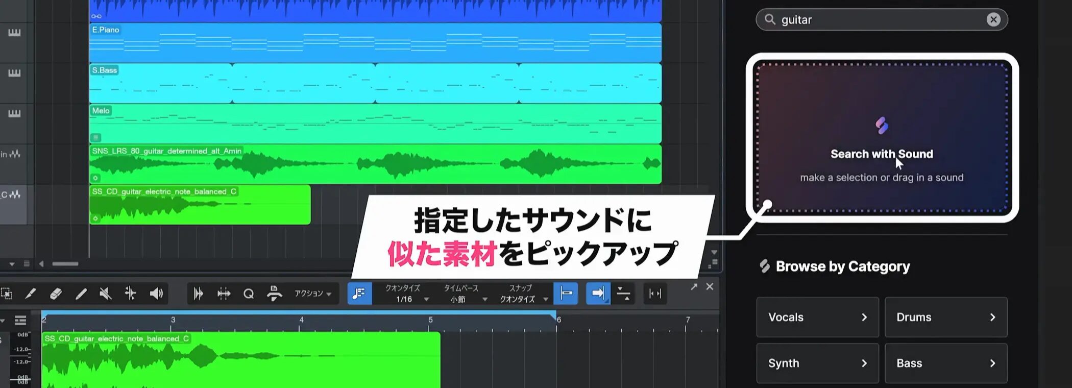 この機能は高い検索精度を誇り、楽曲の統一感を保ちながら複数の素材を選択する際に非常に便利です。
