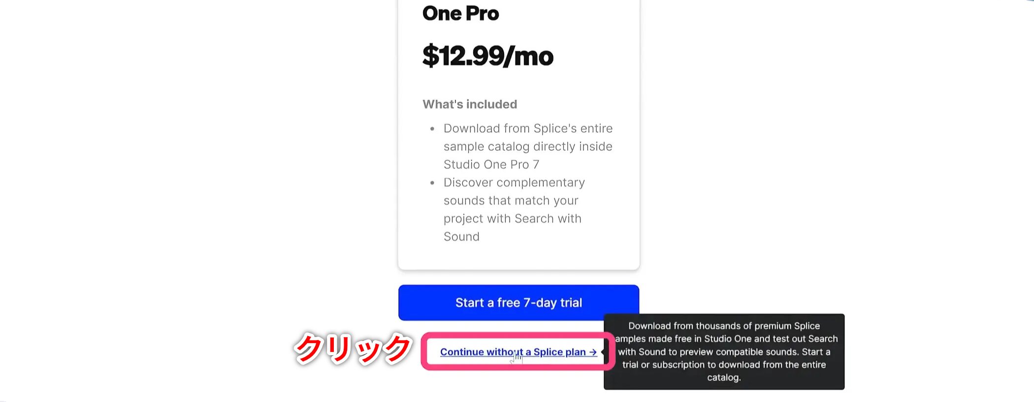 有料アカウントへの登録案内が表示されますが、今回は無料版アカウントを使用するため、画面下部のリンクをクリックします。