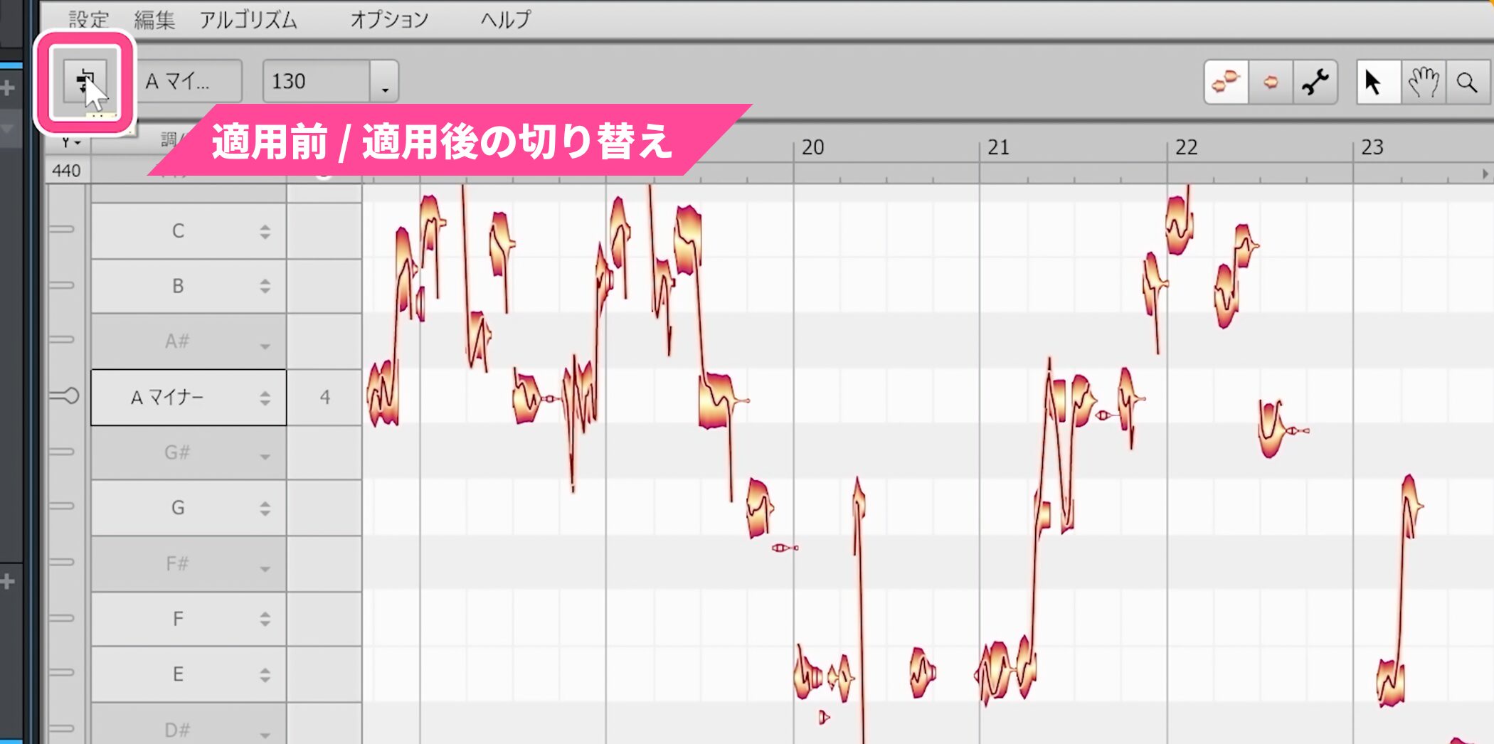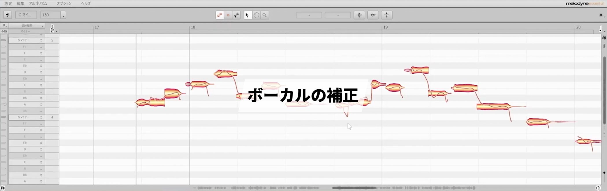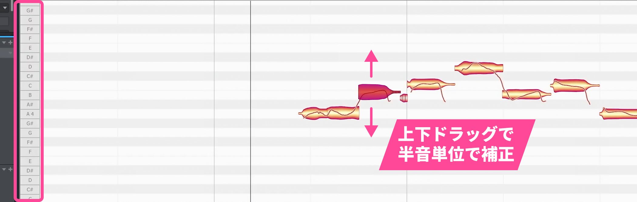 ノートを選択して上下に移動すると、半音単位で補正が行えます。