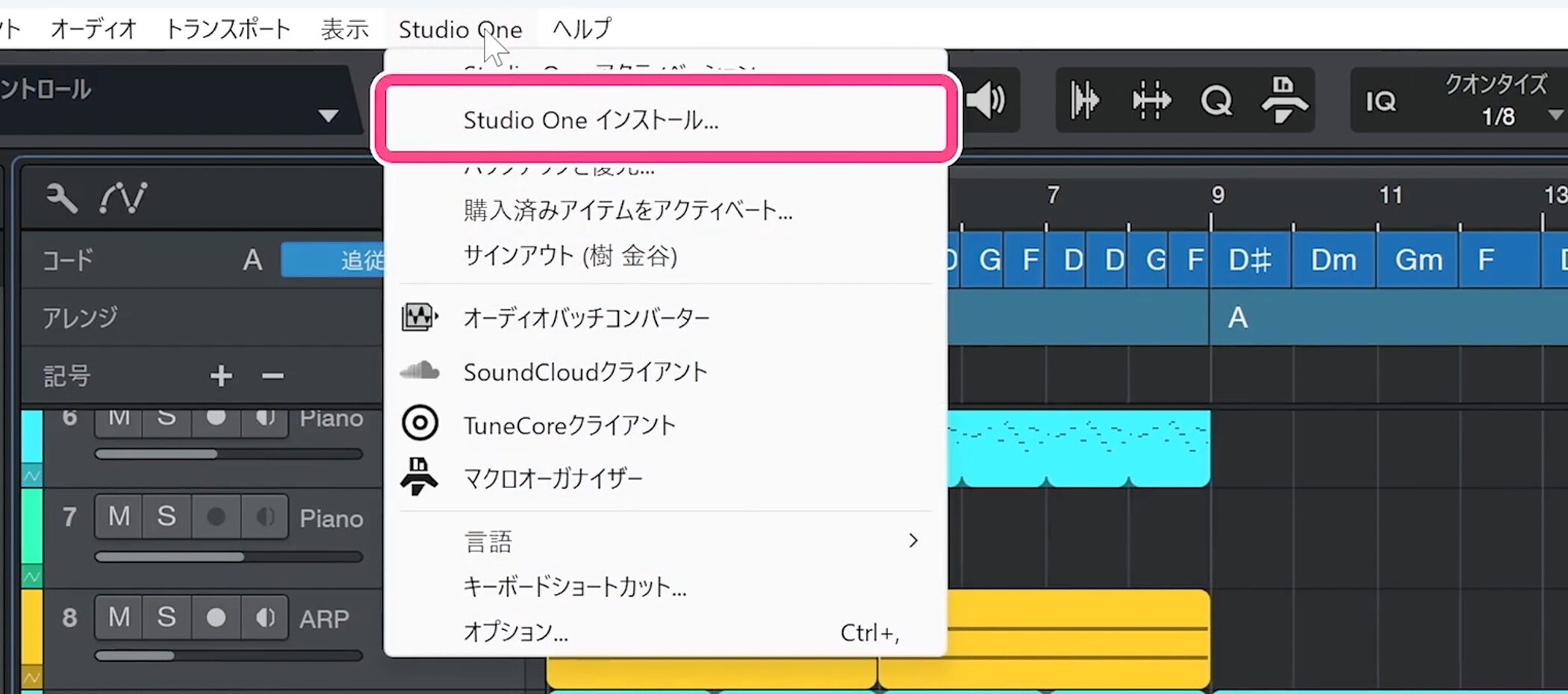 上メニューの「Studio One」から「Studio One インストール」を開きます。