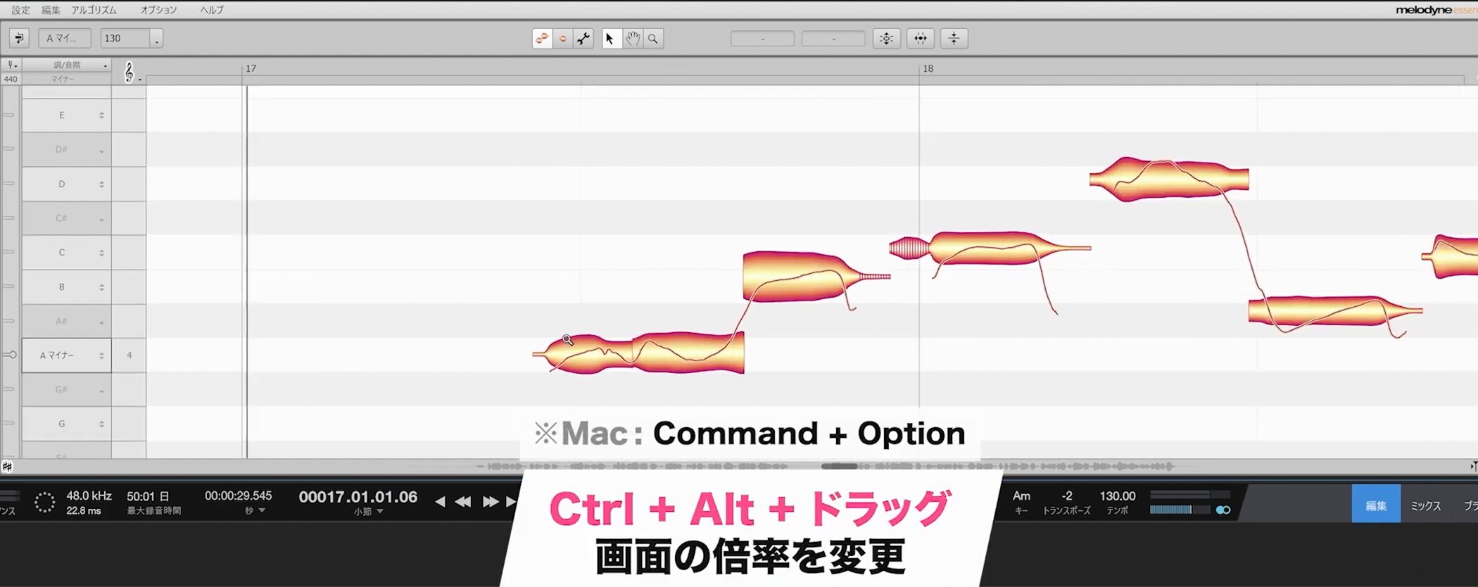 ピッチと同様に、Altキーを押しながらドラッグすることで微調整が行えます。