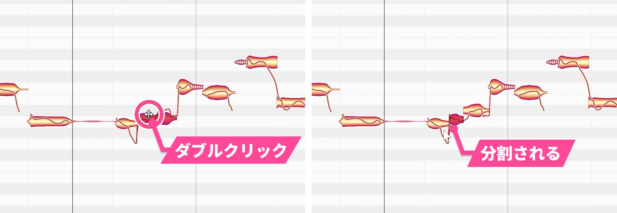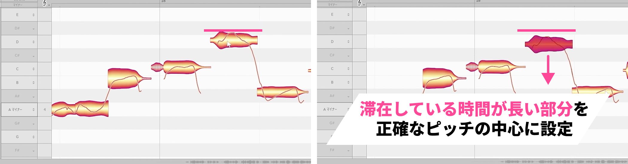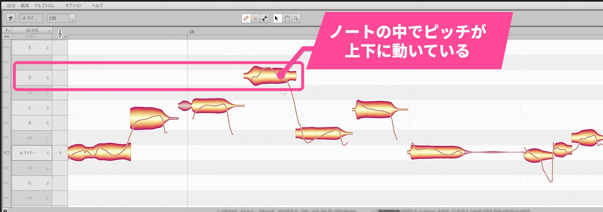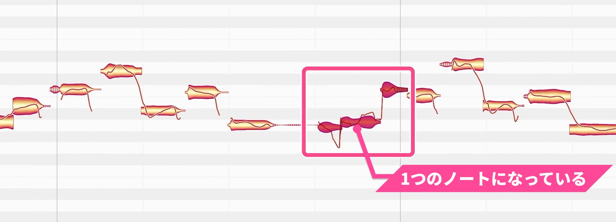ノートの中にある曲線はピッチの動きを表しており、ノート1つはピッチの動きを分かりやすく平均化した状態で表示されています。