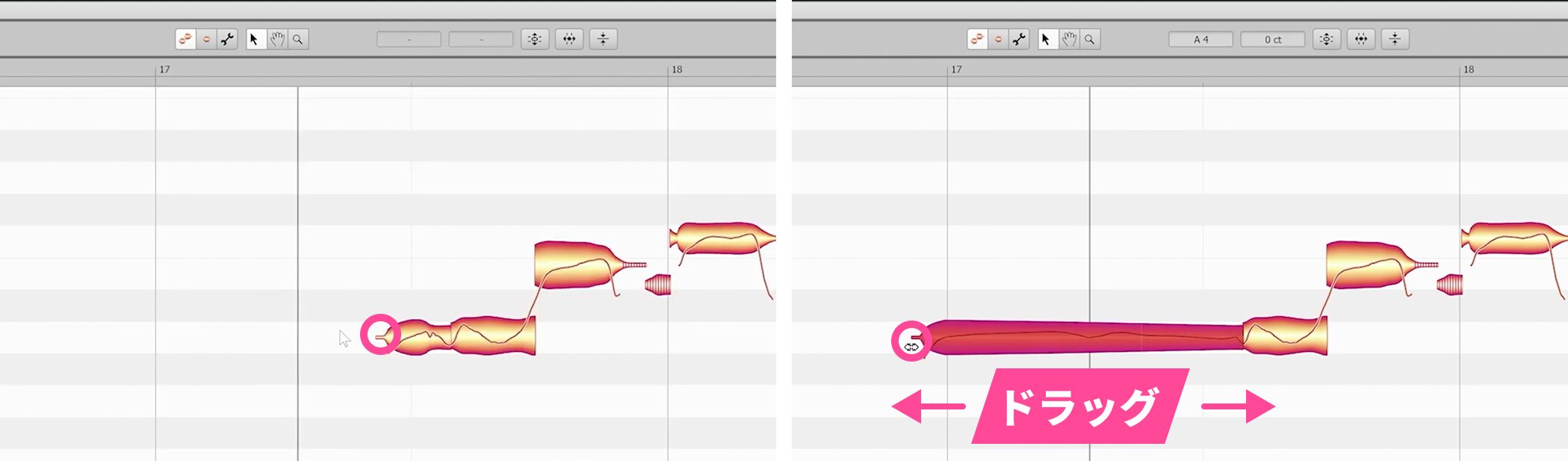 タイミングの補正は、ノートの端を掴んでドラッグすることで調整できます。